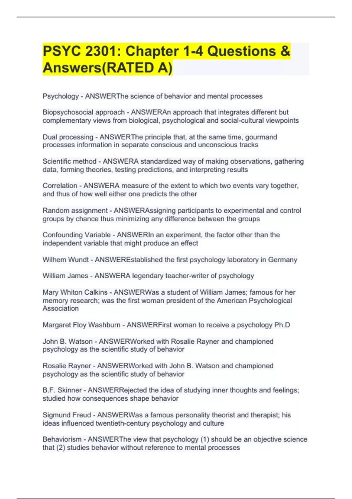 PSYC 2301: Chapter 1-4 Questions & Answers(RATED A)
