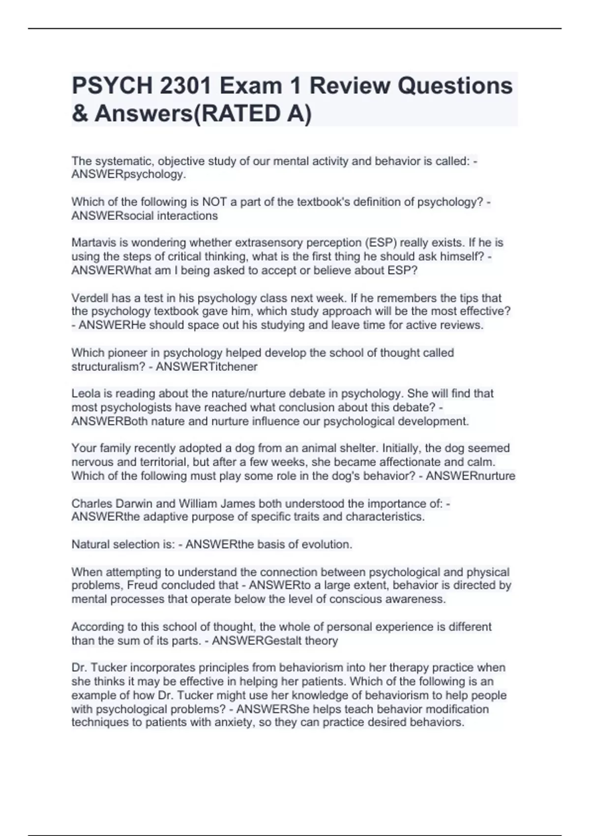 PSYCH 2301 Exam 1 Review Questions & Answers(RATED A)