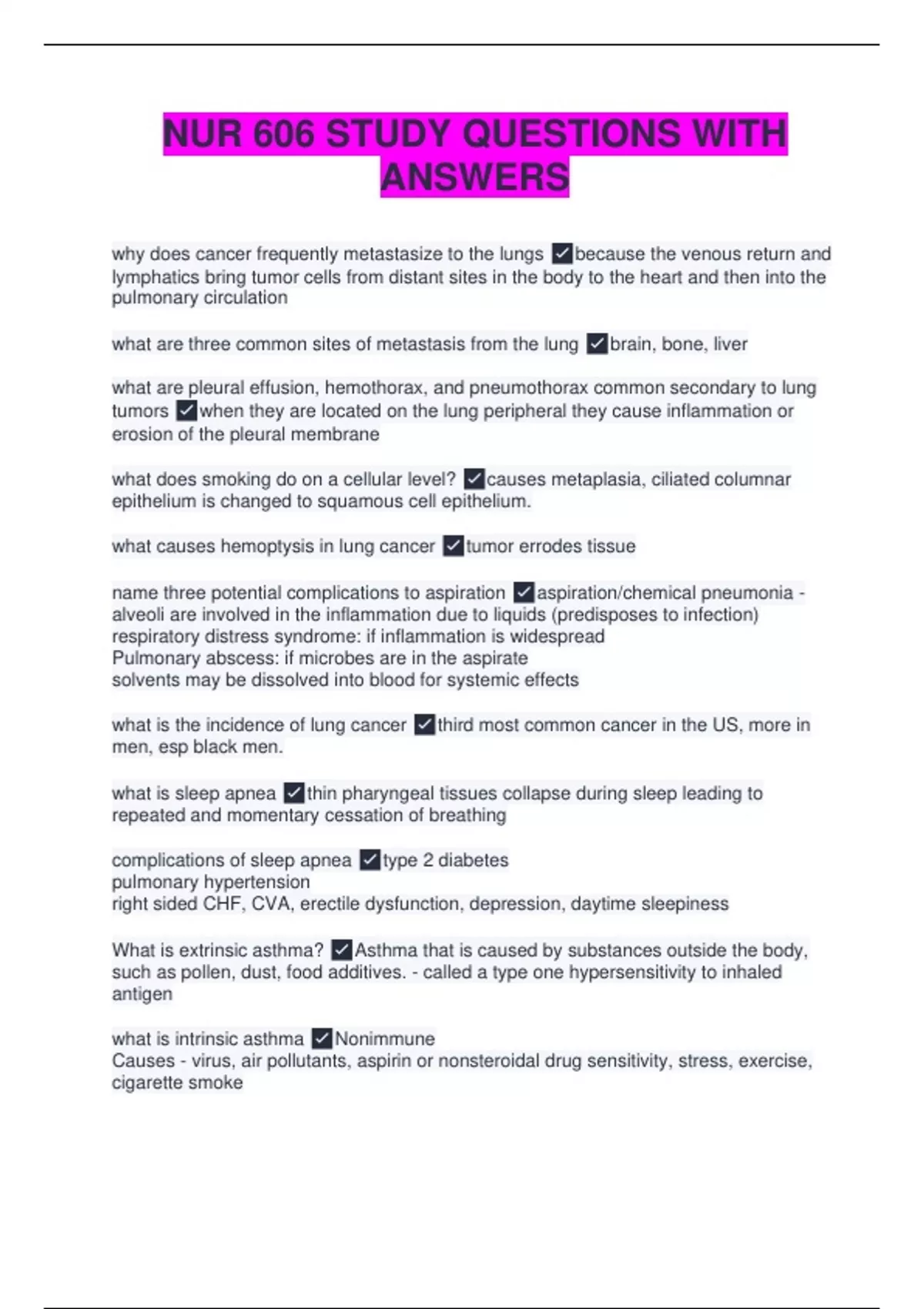 why does cancer frequently metastasize to the lungs because the venous return and lymphatics bring tumor cells from distant sites in the body to the heart and then into the pulmonary circulation what are three common sites of metastasis from the lung brain, bone, liver what are pleural effusion, hemothorax, and pneumothorax common secondary to lung tumors when they are located on the lung peripheral they cause inflammation or erosion of the pleural membrane what does smoking do on a cellular level? causes metaplasia, ciliated columnar epithelium is changed to squamous cell epithelium. what causes hemoptysis in lung cancer tumor errodes tissue name three potential complications to aspiration aspiration/chemical pneumonia - alveoli are involved in the inflammation due to liquids (predisposes to infection) respiratory distress syndrome: if inflammation is widespread Pulmonary abscess: if microbes are in the aspirate solvents may be dissolved into blood for systemic effects what is the incidence of lung cancer third most common cancer in the US, more in men, esp black men. what is sleep apnea thin pharyngeal tissues collapse during sleep leading to repeated and momentary cessation of breathing complications of sleep apnea type 2 diabetes pulmonary hypertension right sided CHF, CVA, erectile dysfunction, depression, daytime sleepiness What is extrinsic asthma? Asthma that is caused by substances outside the body, such as pollen, dust, food additives. - called a type one hypersensitivity to inhaled antigen what is intrinsic asthma Nonimmune Causes - virus, air pollutants, aspirin or nonsteroidal drug sensitivity, stress, exercise, cigarette smoke