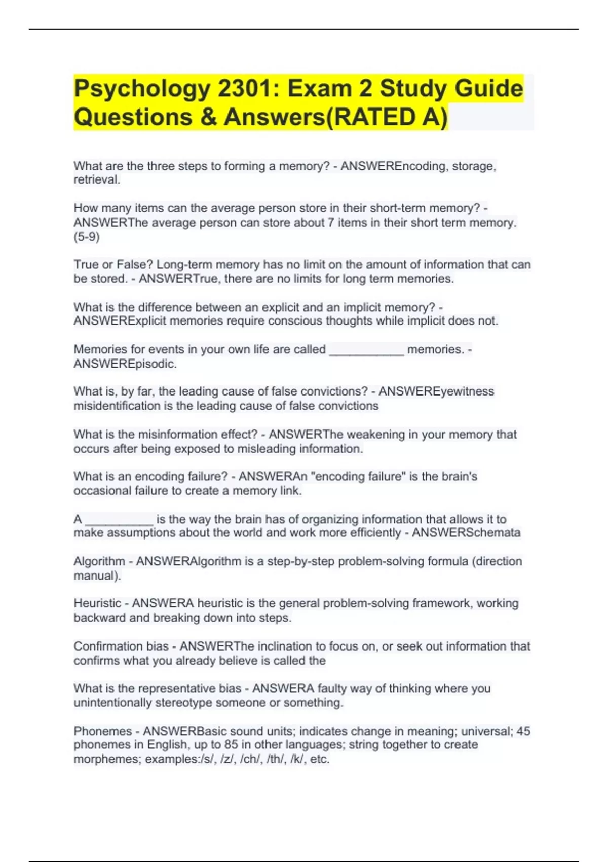 Psychology 2301: Exam 2 Study Guide Questions & Answers(RATED A)
