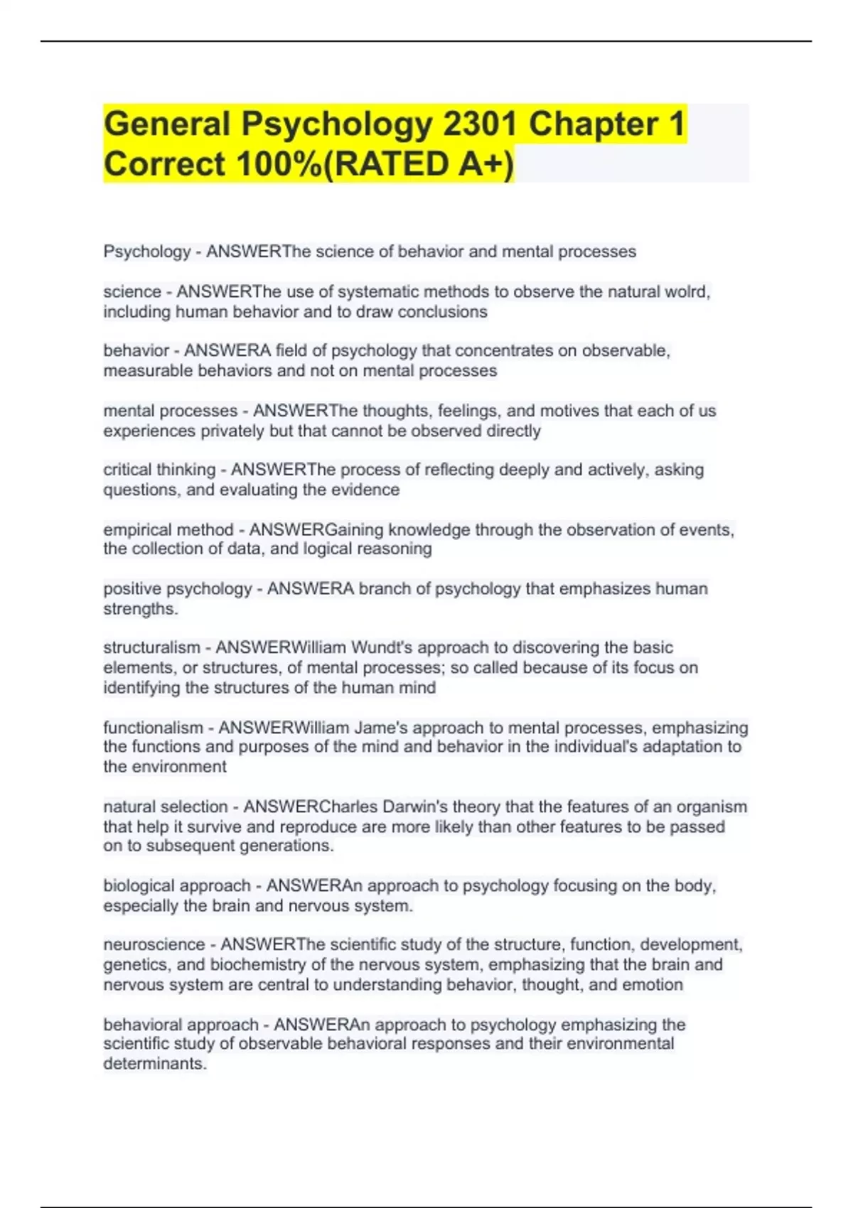 General Psychology 2301 Chapter 1 Correct 100%(RATED A+)