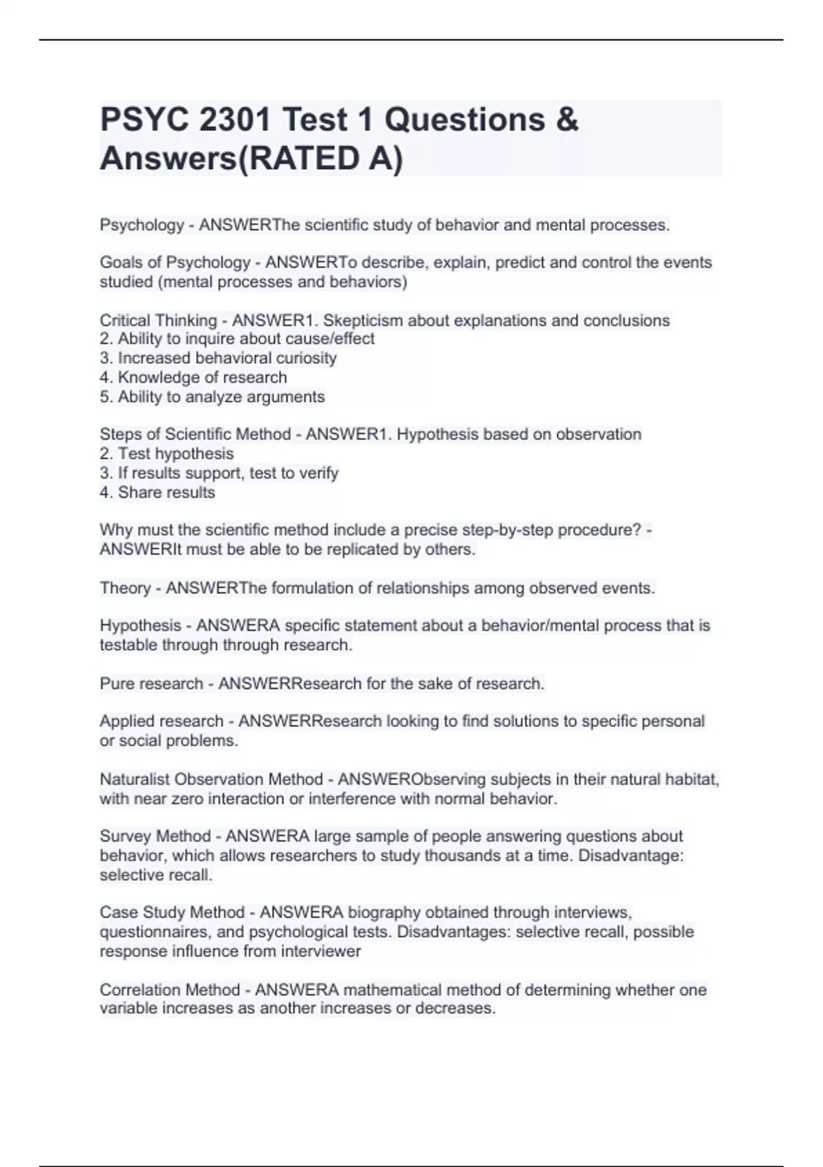 Psychology - ANSWERThe scientific study of behavior and mental processes. Goals of Psychology - ANSWERTo describe, explain, predict and control the events studied (mental processes and behaviors) Critical Thinking - ANSWER1. Skepticism about explanations and conclusions 2. Ability to inquire about cause/effect 3. Increased behavioral curiosity 4. Knowledge of research 5. Ability to analyze arguments Steps of Scientific Method - ANSWER1. Hypothesis based on observation 2. Test hypothesis 3. If results support, test to verify 4. Share results Why must the scientific method include a precise step-by-step procedure? - ANSWERIt must be able to be replicated by others. Theory - ANSWERThe formulation of relationships among observed events. Hypothesis - ANSWERA specific statement about a behavior/mental process that is testable through through research. Pure research - ANSWERResearch for the sake of research. Applied research - ANSWERResearch looking to find solutions to specific personal or social problems. Naturalist Observation Method - ANSWERObserving subjects in their natural habitat, with near zero interaction or interference with normal behavior.