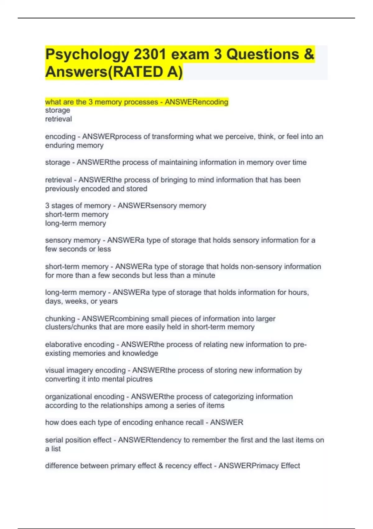 what are the 3 memory processes - ANSWERencoding storage retrieval encoding - ANSWERprocess of transforming what we perceive, think, or feel into an enduring memory storage - ANSWERthe process of maintaining information in memory over time retrieval - ANSWERthe process of bringing to mind information that has been previously encoded and stored 3 stages of memory - ANSWERsensory memory short-term memory long-term memory sensory memory - ANSWERa type of storage that holds sensory information for a few seconds or less short-term memory - ANSWERa type of storage that holds non-sensory information for more than a few seconds but less than a minute long-term memory - ANSWERa type of storage that holds information for hours, days, weeks, or years chunking - ANSWERcombining small pieces of information into larger clusters/chunks that are more easily held in short-term memory elaborative encoding - ANSWERthe process of relating new information to pre-existing memories and knowledge visual imagery encoding - ANSWERthe process of storing new information by converting it into mental picutres organizational encoding - ANSWERthe process of categorizing information according to the relationships among a series of items