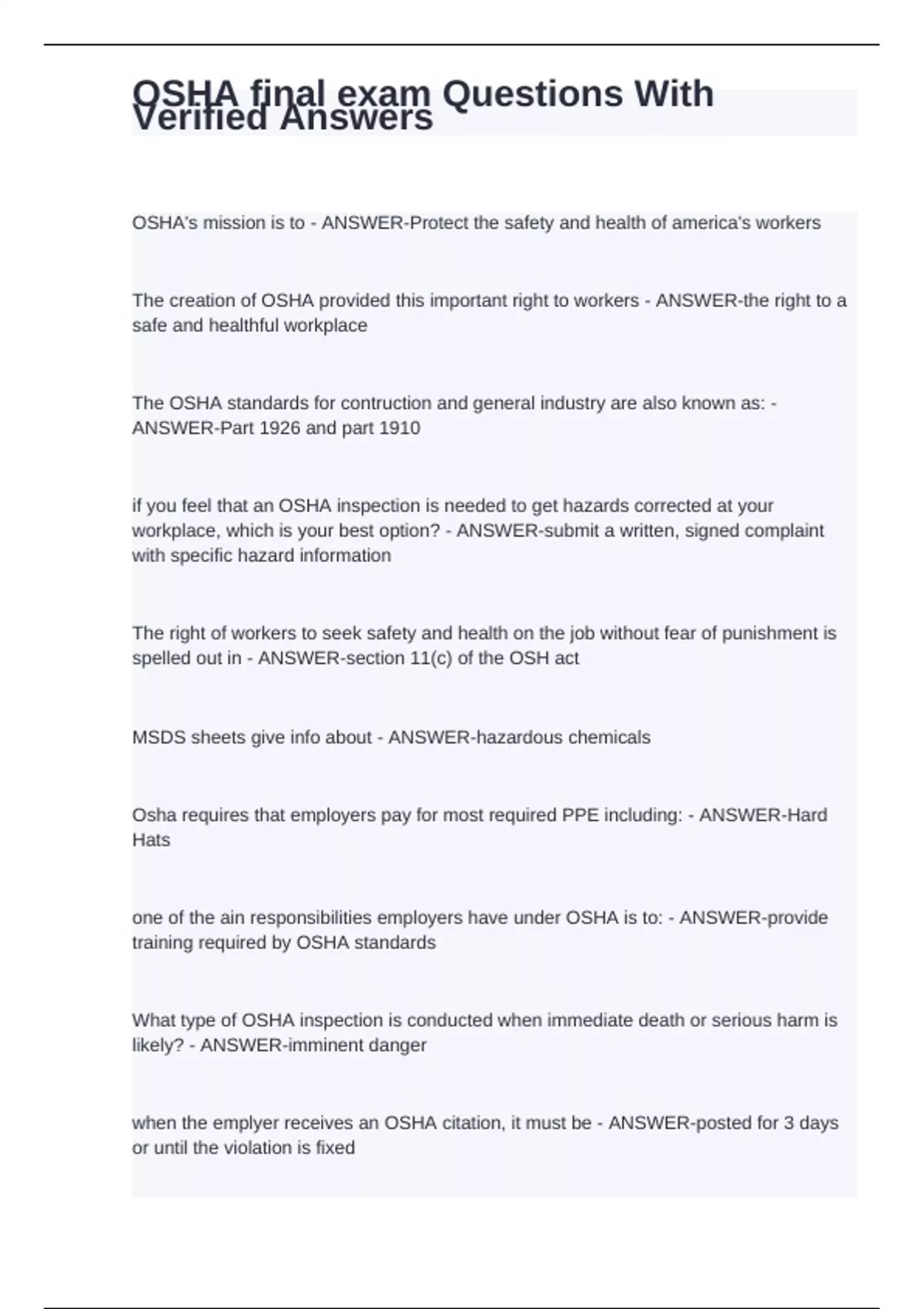 OSHA's mission is to - ANSWER-Protect the safety and health of america's workers The creation of OSHA provided this important right to workers - ANSWER-the right to a safe and healthful workplace The OSHA standards for contruction and general industry are also known as: - ANSWER-Part 1926 and part 1910 if you feel that an OSHA inspection is needed to get hazards corrected at your workplace, which is your best option? - ANSWER-submit a written, signed complaint with specific hazard information The right of workers to seek safety and health on the job without fear of punishment is spelled out in - ANSWER-section 11(c) of the OSH act MSDS sheets give info about - ANSWER-hazardous chemicals Osha requires that employers pay for most required PPE including: - ANSWER-Hard Hats one of the ain responsibilities employers have under OSHA is to: - ANSWER-provide training required by OSHA standards What type of OSHA inspection is conducted when immediate death or serious harm is likely? - ANSWER-imminent danger when the emplyer receives an OSHA citation, it must be - ANSWER-posted for 3 days or until the violation is fixed during an osha inspection - ANSWER-you have the right t talk to the inspector privately among the rights related to osha recordkeeping, workers have the right to review - ANSWER-the osha 300 log and teh OSHA 300A summary The abatement date is the date to - ANSWER-correct violation within 10 calendar days after _______, the employer must certify to OSHS that each cited violation has been abated - ANSWER-abatement date