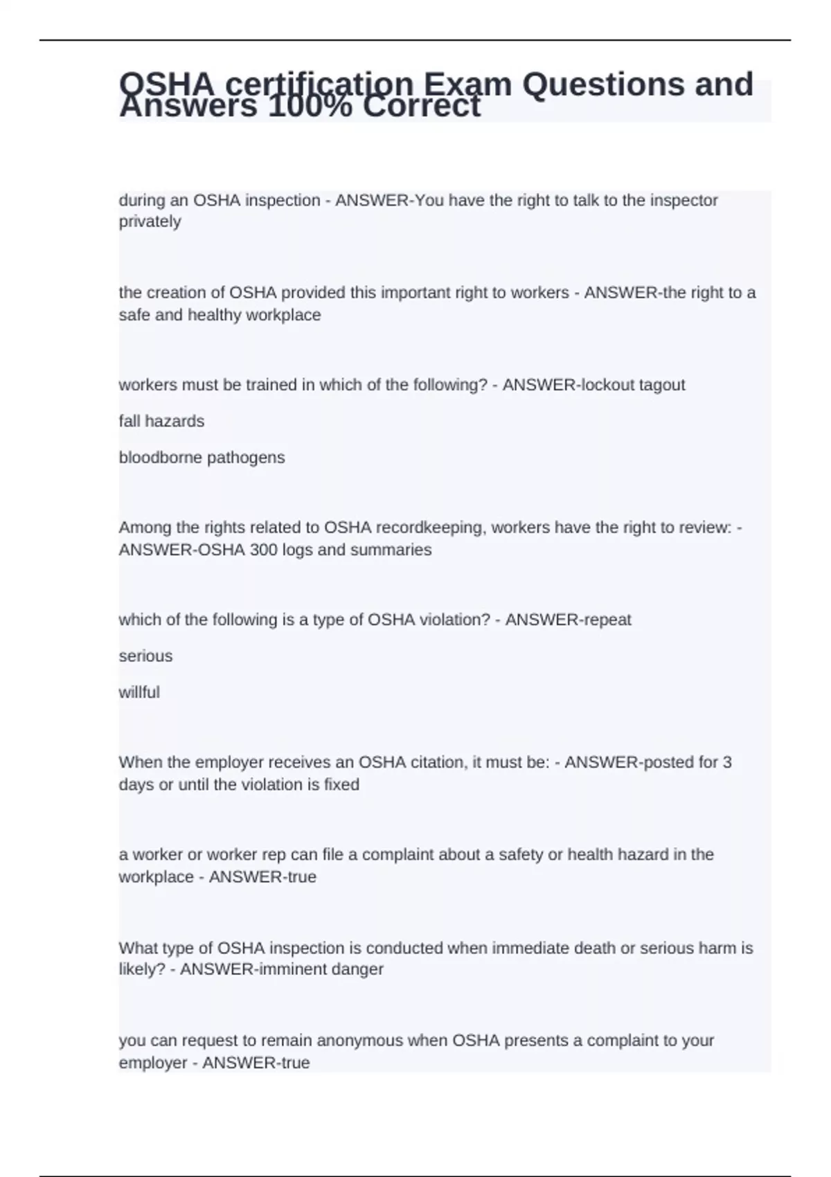 during an OSHA inspection - ANSWER-You have the right to talk to the inspector privately the creation of OSHA provided this important right to workers - ANSWER-the right to a safe and healthy workplace workers must be trained in which of the following? - ANSWER-lockout tagout fall hazards bloodborne pathogens Among the rights related to OSHA recordkeeping, workers have the right to review: - ANSWER-OSHA 300 logs and summaries which of the following is a type of OSHA violation? - ANSWER-repeat serious willful When the employer receives an OSHA citation, it must be: - ANSWER-posted for 3 days or until the violation is fixed a worker or worker rep can file a complaint about a safety or health hazard in the workplace - ANSWER-true What type of OSHA inspection is conducted when immediate death or serious harm is likely? - ANSWER-imminent danger you can request to remain anonymous when OSHA presents a complaint to your employer - ANSWER-true which of the following is a way that an employee can contact OSHA - ANSWER-email in person phone who does OSHA recommend you first bring a workplace safety or health concern to - ANSWER-your employer what section of the OSHA act does the whistleblower program reference - ANSWER-section 11(c) typically how long does an employee have to file a complaint with osha when the employee has been discrimated against for reporting a safety or health hazard? - ANSWER-30 days what are two government agencies that are good resources for safety and health information - ANSWER-OSHA and NIOSH which of the following would be best to have when consulting a medical professional about possible exposure to a harmful chemical - ANSWER-safety data sheet for the chemical