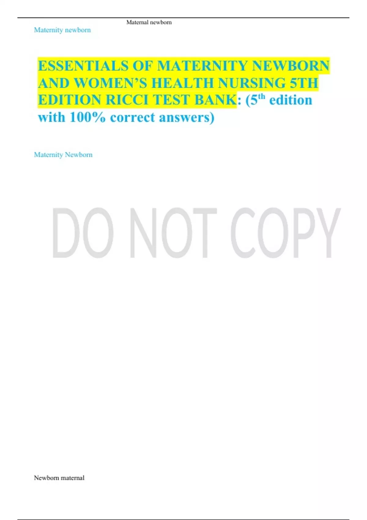 ESSENTIALS OF MATERNITY NEWBORN AND WOMEN’S HEALTH NURSING 5TH EDITION RICCI TEST BANK: (5th edition with 100% correct answers)