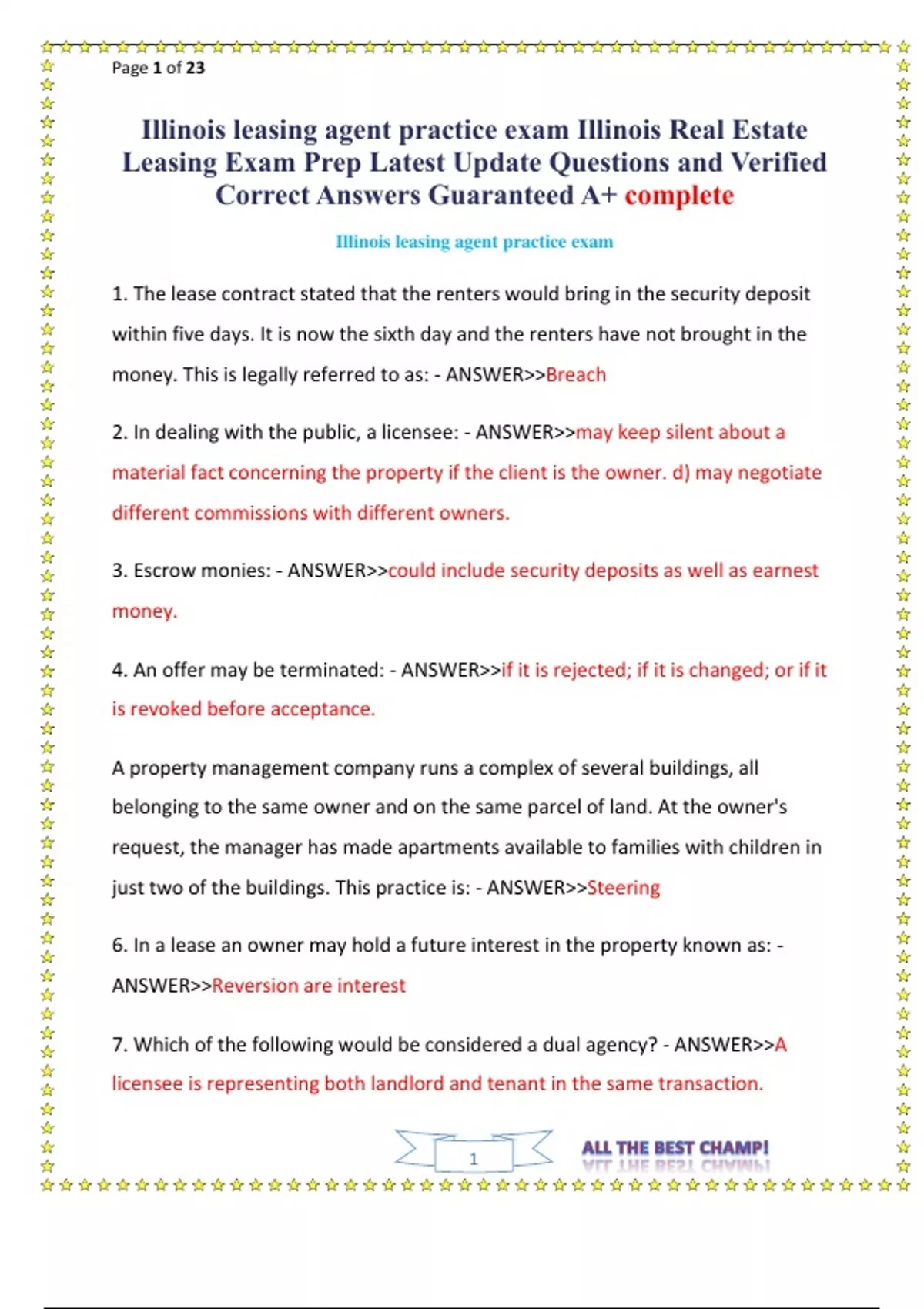 Illinois leasing agent practice exam Illinois Real Estate Leasing Exam Prep Latest Update Questions and Verified Correct Answers Guaranteed A+ complete