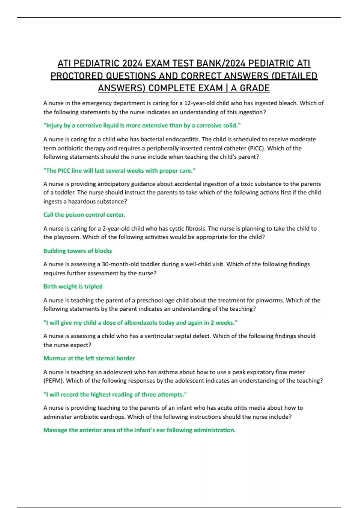 ATI PEDIATRIC 2024 EXAM TEST BANK/2024 PEDIATRIC ATI PROCTORED QUESTIONS AND CORRECT ANSWERS (DETAILED ANSWERS) COMPLETE EXAM | A GRADE