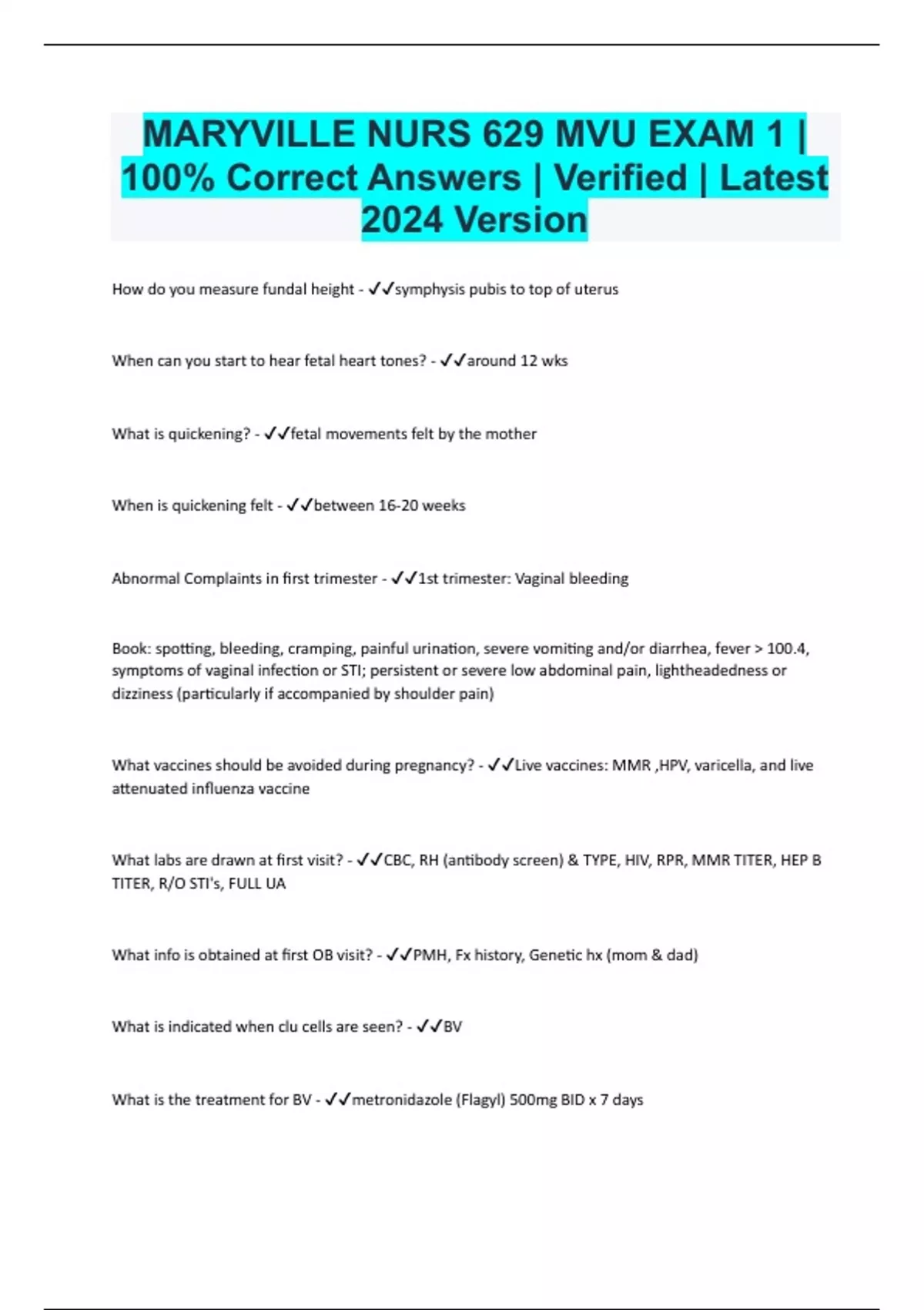 MARYVILLE NURS 629 MVU EXAM 1 | 100% Correct Answers | Verified | Latest 2024 Version How do you measure fundal height - symphysis pubis to top of uterus When can you start to hear fetal heart tones? - around 12 wks What is quickening? - fetal movements felt by the mother When is quickening felt - between 16-20 weeks Abnormal Complaints in first trimester - 1st trimester: Vaginal bleeding Book: spotting, bleeding, cramping, painful urination, severe vomiting and/or diarrhea, fever > 100.4, symptoms of vaginal infection or STI; persistent or severe low abdominal pain, lightheadedness or dizziness (particularly if accompanied by shoulder pain) What vaccines should be avoided during pregnancy? - Live vaccines: MMR ,HPV, varicella, and live attenuated influenza vaccine What labs are drawn at first visit? - CBC, RH (antibody screen) & TYPE, HIV, RPR, MMR TITER, HEP B TITER, R/O STI's, FULL UA What info is obtained at first OB visit? - PMH, Fx history, Genetic hx (mom & dad) What is indicated when clu cells are seen? - BV What is the treatment for BV - metronidazole (Flagyl) 500mg BID x 7 days What are presumptive (subjective) signs of pregnancy? - Amenorrhea, N/V, FATIGUE, urine frequency, breast changes, quickening, pigment, striae What are probable (objective) signs of pregnancy? - + HCG, enlarged Abdo, fetal outline, Balloment, Braxton, Chadwick's, Goodall's, Hegar's signs What are positive signs of pregnancy? - Fetal HT, U/S, fetal movement What does a bluish cervix indicate? - Chadwick's sign How to use Nageles rule - + 7 days - 3 mos What are signs of preeclampsia? - rapid weight gain, edema to hands and face, HTN, H/A, visual changes, proteinuria, epigastric pain What is the treatment of preeclampsia? - Bedrest, (nifedipine, hydralazine) if severe delivery of the fetus What does HELLP stand for? - hemolysis, elevated liver enzymes, low platelets S/S of HELLP - EDEMA, N/V, RUQ pain What should 'at home' plan be for preeclampsia? - high protein diet, daily kick counts, wkly non- stress test & contraction monitor, monitor for hand and face edema, visual changes, B/P, epigastric pain When will you see a drop in the fundal height? - at 36 weeks as the head drops into canal When is subinvolution suspected - when lochia turns bright red with clots How would you treat subinvolution? - Methergine 0.2mg PO TID for up to a week what education should be given with a subinvolution? - if filling pad in an hour or lemon size clots go to ED, if fever culture discharge Clinical presentation of mastitis? - unilateral breast red, painful, warm to touch usually clogged milk duct What education do you give with mastatitis - Continue to BF, Pump if breast are still hard after feeding, warm compress What B/C is used if still breastfeeding? - Progesterone only When and how to screen for 1 hr GTT - between 24-28 wks, no need to fast, if over 140 then 3 hr GTT is needed How is gestational diabetes diagnosed? - if the 1 hr gtt is >180 auto dx; if 3 hr gtt is 95 fasting, >180 @ 1hr, >153 @ 2 hr, >140 @ 3 hr What is considered a good kick count? - 10 or more movements in 2 hrs What are normal PAP guidelines? - 1st at age 21 regardless of sexual activity Q 3 yrs until 29 Q 5 yrs 30-65 What can be used to treat nausea in pregnancy - zofran 4 mg up to 3 times a day, can cause Extrapyramidal symptoms (EPS) inform provider What to educate on with N/V - keep a list of associated factors (food/activity), rest when nauseated, avoid stress & triggers (smells/sights), avoid tight clothing, meditation/relaxation techniques What is the treatment for trichomoniasis - metronidazole (Flagyl) 2g, single-dose, notify partner, no sex for 7 days after treatment, educate on using condoms How to treat vaginal candidiasis - Miconazole (monostat) cream or vaginal suppository QHS x 7 days 3 danger signs to report to provider - bleeding, severe cramping/abdo pain, painful urination What to educate on intercourse during pregnancy - generally safe, but some contraindications are threatened miscarriage (spotting/bleeding), avoid inserting anything into the vaginal for at least 2 weeks after bleeding stops screening tests in the 2nd trimester - 1 hr gtt, fetal anatomy scan (U/S) how to prevent neural tube defect in first trimester - folic acid (400 MCG) and vitamins 3 months prior to pregnancy What is the should average weight gain be for BMI of 18.5-24.9 - 25-35 pounds What OTC should be avoiding - Aspirin