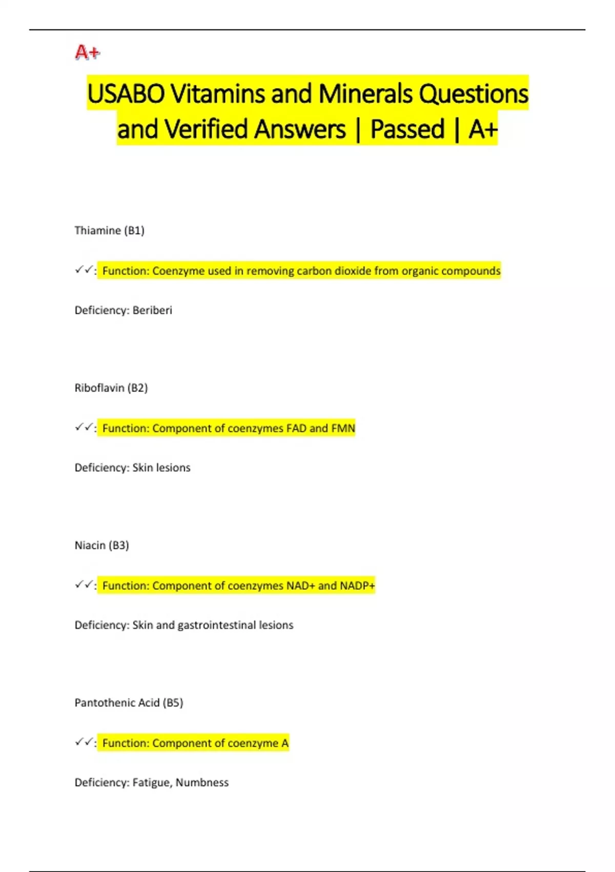 USABO Vitamins and Minerals Questions and Verified Answers | Passed | A+