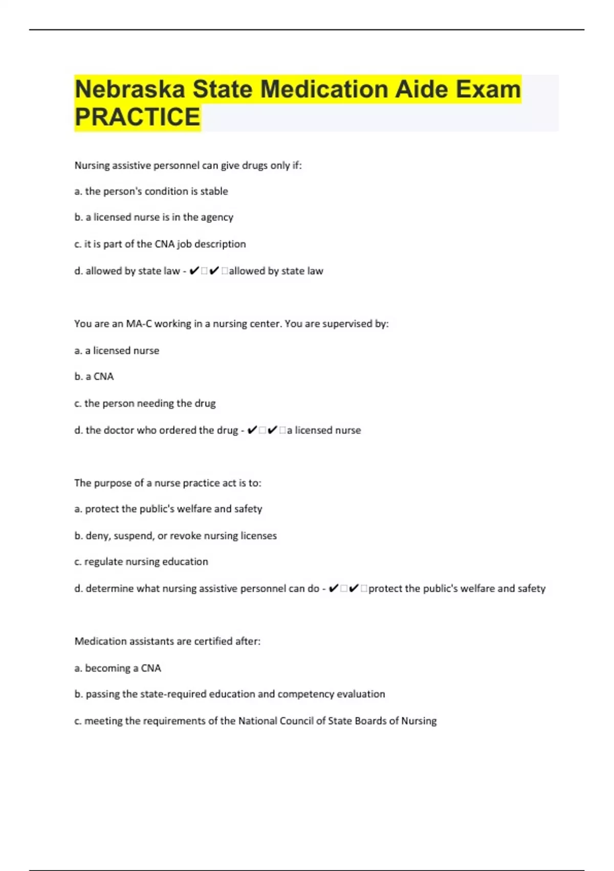 Nursing assistive personnel can give drugs only if: a. the person's condition is stable b. a licensed nurse is in the agency c. it is part of the CNA job description d. allowed by state law - ️️allowed by state law You are an MA-C working in a nursing center. You are supervised by: a. a licensed nurse b. a CNA c. the person needing the drug d. the doctor who ordered the drug - ️️a licensed nurse The purpose of a nurse practice act is to: a. protect the public's welfare and safety b. deny, suspend, or revoke nursing licenses c. regulate nursing education d. determine what nursing assistive personnel can do - ️️protect the public's welfare and safety Medication assistants are certified after: a. becoming a CNA b. passing the state-required education and competency evaluation c. meeting the requirements of the National Council of State Boards of Nursing d. working 1 year as a CNA - ️️passing the state-required education and competency evaluation