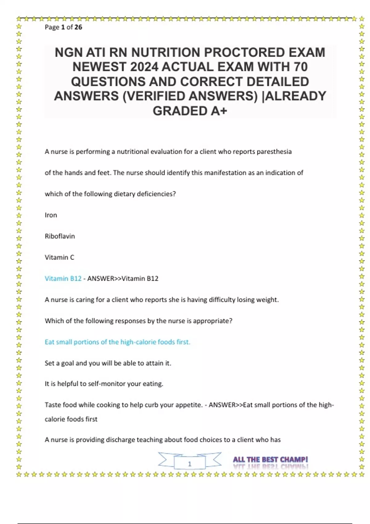 NGN ATI RN NUTRITION PROCTORED EXAM NEWEST 2024 ACTUAL EXAM WITH 70 QUESTIONS AND CORRECT DETAILED ANSWERS (VERIFIED ANSWERS) ALREADY GRADED A+