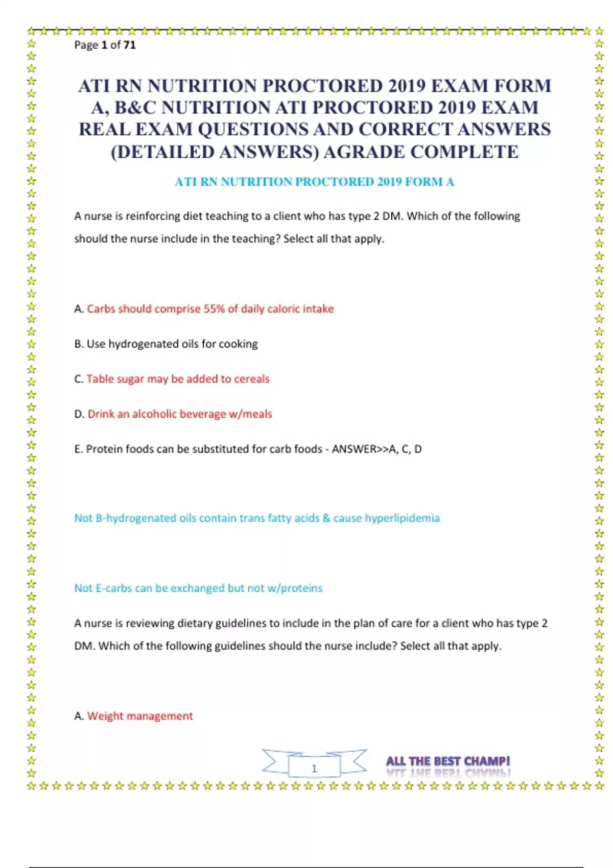 ATI RN NUTRITION PROCTORED 2019 EXAM FORM A, B&C NUTRITION ATI PROCTORED 2019 EXAM REAL EXAM QUESTIONS AND CORRECT ANSWERS (DETAILED ANSWERS) AGRADE COMPLETE