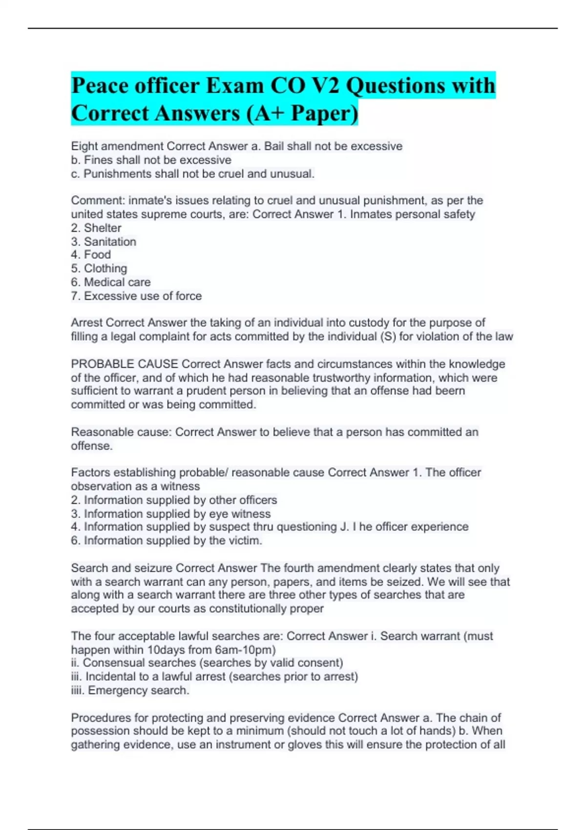 Eight amendment Correct Answer a. Bail shall not be excessive b. Fines shall not be excessive c. Punishments shall not be cruel and unusual. Comment: inmate's issues relating to cruel and unusual punishment, as per the united states supreme courts, are: Correct Answer 1. Inmates personal safety 2. Shelter 3. Sanitation 4. Food 5. Clothing 6. Medical care 7. Excessive use of force Arrest Correct Answer the taking of an individual into custody for the purpose of filling a legal complaint for acts committed by the individual (S) for violation of the law PROBABLE CAUSE Correct Answer facts and circumstances within the knowledge of the officer, and of which he had reasonable trustworthy information, which were sufficient to warrant a prudent person in believing that an offense had beern committed or was being committed. Reasonable cause: Correct Answer to believe that a person has committed an offense. Factors establishing probable/ reasonable cause Correct Answer 1. The officer observation as a witness 2. Information supplied by other officers 3. Information supplied by eye witness 4. Information supplied by suspect thru questioning J. I he officer experience 6. Information supplied by the victim. Search and seizure Correct Answer The fourth amendment clearly states that only with a search warrant can any person, papers, and items be seized. We will see that along with a search warrant there are three other types of searches that are accepted by our courts as constitutionally proper The four acceptable lawful searches are: Correct Answer i. Search warrant (must happen within 10days from 6am-10pm) ii. Consensual searches (searches by valid consent) iii. Incidental to a lawful arrest (searches prior to arrest) iiii. Emergency search. Procedures for protecting and preserving evidence Correct Answer a. The chain of possession should be kept to a minimum (should not touch a lot of hands) b. When gathering evidence, use an instrument or gloves this will ensure the protection of all