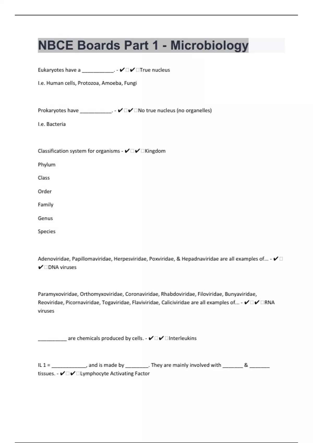 Eukaryotes have a ___________. - ️️True nucleus I.e. Human cells, Protozoa, Amoeba, Fungi Prokaryotes have ___________. - ️️No true nucleus (no organelles) I.e. Bacteria Classification system for organisms - ️️Kingdom Phylum Class Order Family Genus Species Adenoviridae, Papillomaviridae, Herpesviridae, Poxviridae, & Hepadnaviridae are all examples of... - ️️DNA viruses Paramyxoviridae, Orthomyxoviridae, Coronaviridae, Rhabdoviridae, Filoviridae, Bunyaviridae, Reoviridae, Picornaviridae, Togaviridae, Flaviviridae, Caliciviridae are all examples of... - ️️RNA viruses __________ are chemicals produced by cells. - ️️Interleukins IL 1 = ____________, and is made by ________. They are mainly involved with _______ & _______ tissues. - ️️Lymphocyte Activating Factor