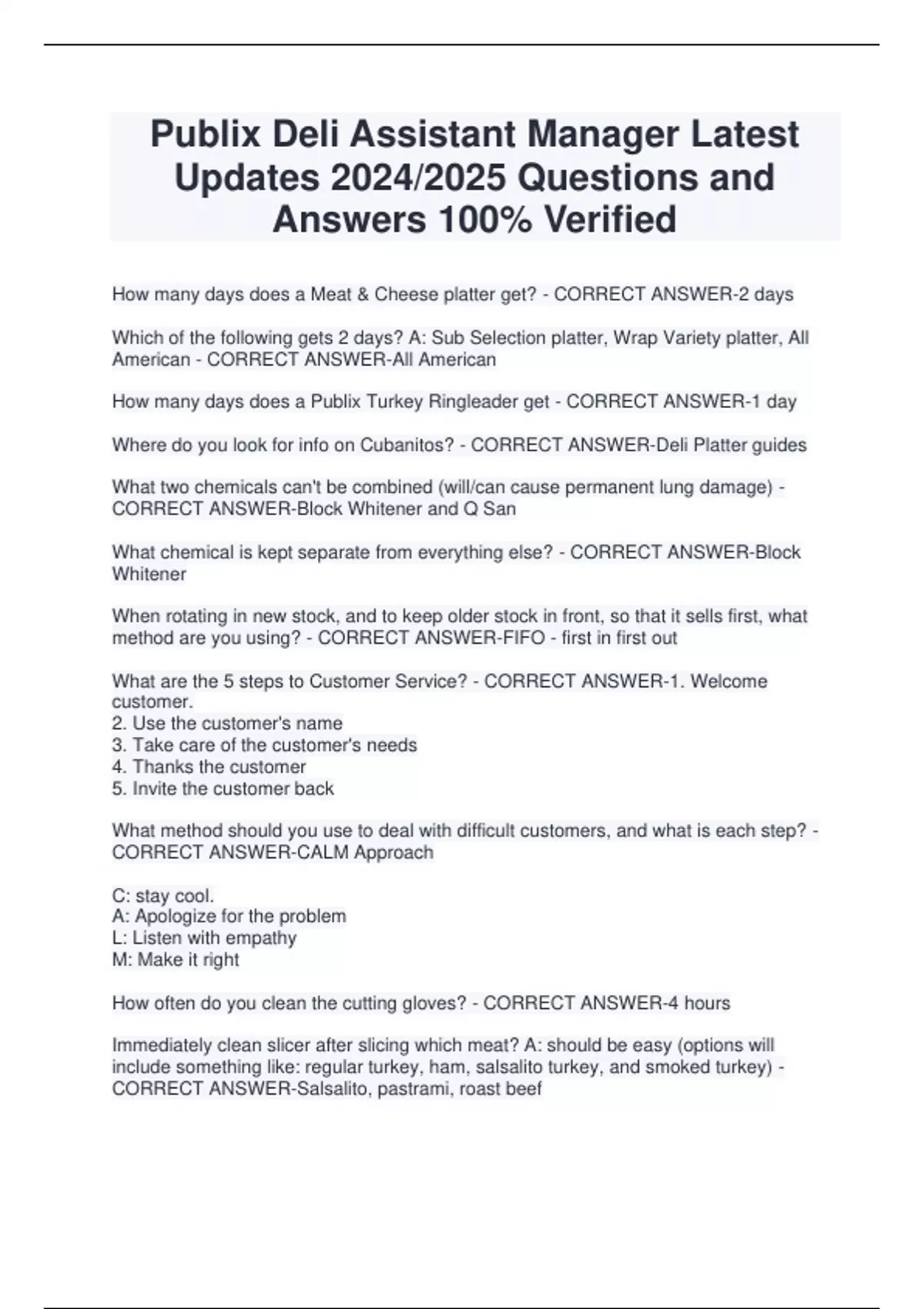 Publix Deli Assistant Manager Latest Updates 2024/2025 Questions and Answers 100% Verified How many days does a Meat & Cheese platter get? - CORRECT ANSWER-2 days Which of the following gets 2 days? A: Sub Selection platter, Wrap Variety platter, All American - CORRECT ANSWER-All American How many days does a Publix Turkey Ringleader get - CORRECT ANSWER-1 day Where do you look for info on Cubanitos? - CORRECT ANSWER-Deli Platter guides What two chemicals can't be combined (will/can cause permanent lung damage) - CORRECT ANSWER-Block Whitener and Q San What chemical is kept separate from everything else? - CORRECT ANSWER-Block Whitener When rotating in new stock, and to keep older stock in front, so that it sells first, what method are you using? - CORRECT ANSWER-FIFO - first in first out What are the 5 steps to Customer Service? - CORRECT ANSWER-1. Welcome customer. 2. Use the customer's name 3. Take care of the customer's needs 4. Thanks the customer 5. Invite the customer back What method should you use to deal with difficult customers, and what is each step? - CORRECT ANSWER-CALM Approach C: stay cool. A: Apologize for the problem L: Listen with empathy M: Make it right How often do you clean the cutting gloves? - CORRECT ANSWER-4 hours Immediately clean slicer after slicing which meat? A: should be easy (options will include something like: regular turkey, ham, salsalito turkey, and smoked turkey) - CORRECT ANSWER-Salsalito, pastrami, roast beef Oil and vinegar at the sub shop gets what FIFO appropriately colored top? - CORRECT ANSWER-Green What color code does grease cutter positive have? - CORRECT ANSWER-Yellow What portion size of corn beef does a reuben sandwich get? - CORRECT ANSWER-6 oz What is the shelf life for the reuben sauerkraut mixture in the cooler? - CORRECT ANSWER-3 days Which BH turkey is only ONE breast? - CORRECT ANSWER-Salsalito Which BH Ham has the lowest sodium per serving? - CORRECT ANSWERBourbonridge technically, or black forest What is the first thing Sub Shop does in the morning? - CORRECT ANSWER-Clean Turbochef By what time should you have completed slicing the Fresh Slice Cheese of the Week? - CORRECT ANSWER-10:00am What is the latest time for production of G&G items? - CORRECT ANSWER-10:00am How often do you clean sub shop knives and utensils? - CORRECT ANSWER-4 hours How often do you wipe down touch points in the deli? - CORRECT ANSWER-4 hours What is the standard serving size for sliced Publix cheese? - CORRECT ANSWER-2 ounces In kitchen at the breading station, how often should the water be changed? - CORRECT ANSWER-1 hour Danish blue cheese is made with milk from what animal? - CORRECT ANSWER-cow's milk How often do you sift the breading? - CORRECT ANSWER-Every two hours Which potato salad has russet potatoes, green and red peppers, onions, mustard, mayo, and eggs? - CORRECT ANSWER-southern style Which of the following is NOT true for Publix German bologna? No msg, no gluten, uses processed pork and beef - CORRECT ANSWER-Gluten