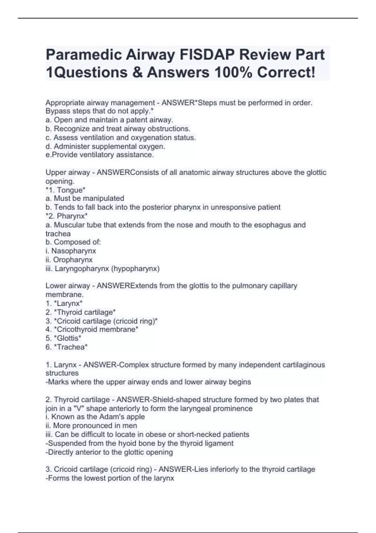 Paramedic Airway FISDAP Review Part 1Questions & Answers 100% Correct!