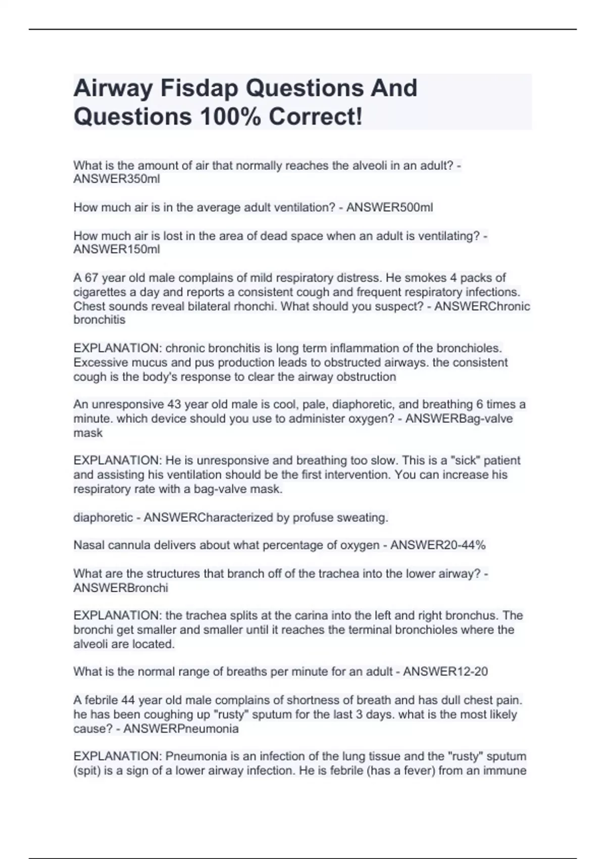What is the amount of air that normally reaches the alveoli in an adult? - ANSWER350ml How much air is in the average adult ventilation? - ANSWER500ml How much air is lost in the area of dead space when an adult is ventilating? - ANSWER150ml A 67 year old male complains of mild respiratory distress. He smokes 4 packs of cigarettes a day and reports a consistent cough and frequent respiratory infections. Chest sounds reveal bilateral rhonchi. What should you suspect? - ANSWERChronic bronchitis EXPLANATION: chronic bronchitis is long term inflammation of the bronchioles. Excessive mucus and pus production leads to obstructed airways. the consistent cough is the body's response to clear the airway obstruction An unresponsive 43 year old male is cool, pale, diaphoretic, and breathing 6 times a minute. which device should you use to administer oxygen? - ANSWERBag-valve mask EXPLANATION: He is unresponsive and breathing too slow. This is a "sick" patient and assisting his ventilation should be the first intervention. You can increase his respiratory rate with a bag-valve mask.