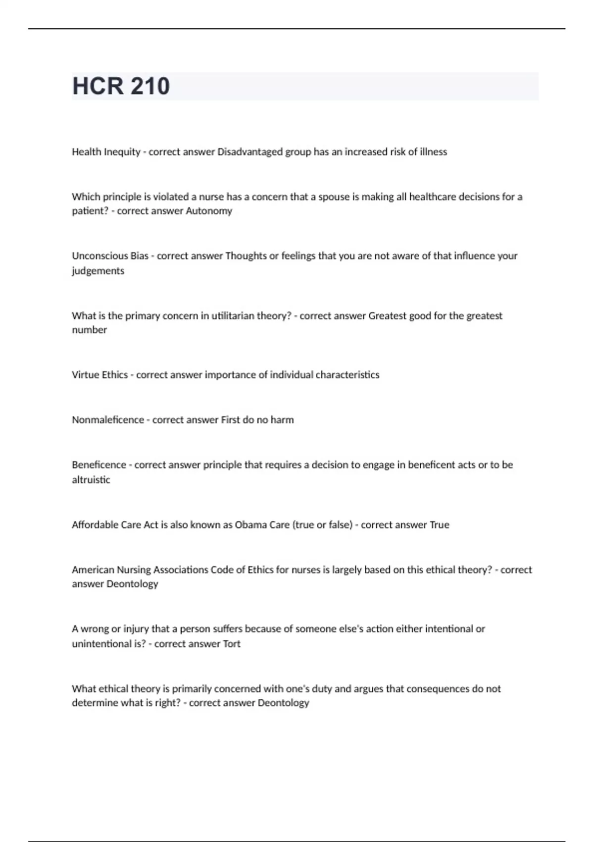 HCR 210Health Inequity - correct answer Disadvantaged group has an increased risk of illness Which principle is violated a nurse has a concern that a spouse is making all healthcare decisions for a patient? - correct answer Autonomy Unconscious Bias - correct answer Thoughts or feelings that you are not aware of that influence your judgements What is the primary concern in utilitarian theory? - correct answer Greatest good for the greatest number Virtue Ethics - correct answer importance of individual characteristics Nonmaleficence - correct answer First do no harm Beneficence - correct answer principle that requires a decision to engage in beneficent acts or to be altruistic Affordable Care Act is also known as Obama Care (true or false) - correct answer True American Nursing Associations Code of Ethics for nurses is largely based on this ethical theory? - correct answer Deontology A wrong or injury that a person suffers because of someone else's action either intentional or unintentional is? - correct answer Tort What ethical theory is primarily concerned with one's duty and argues that consequences do not determine what is right? - correct answer Deontology