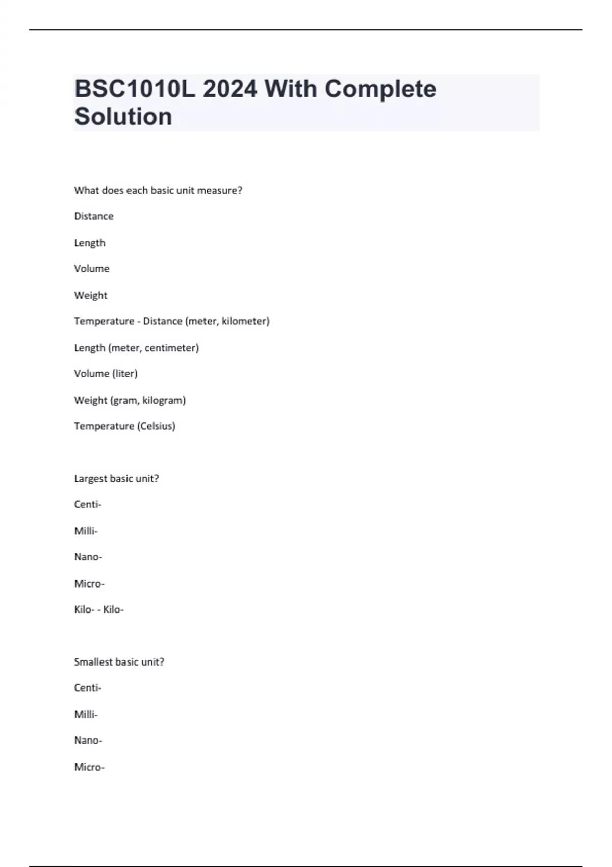 BSC1010L 2024 With Complete Solution What does each basic unit measure? Distance Length Volume Weight Temperature - Distance (meter, kilometer).......