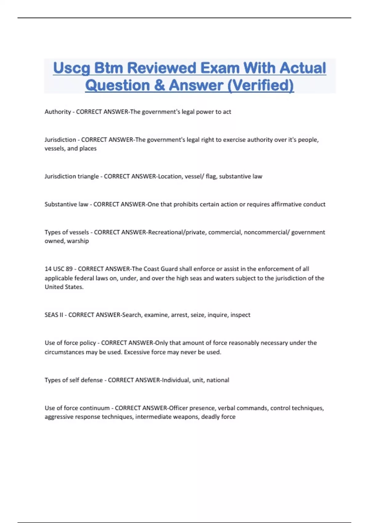 Uscg Btm Reviewed Exam With Actual Question & Answer (Verified) Authority - CORRECT ANSWER-The government's legal power to act Jurisdiction - CORRECT ANSWER-The government's legal right to exercise authority over it's people, vessels, and places Jurisdiction triangle - CORRECT ANSWER-Location, vessel/ flag, substantive law Substantive law - CORRECT ANSWER-One that prohibits certain action or requires affirmative conduc
