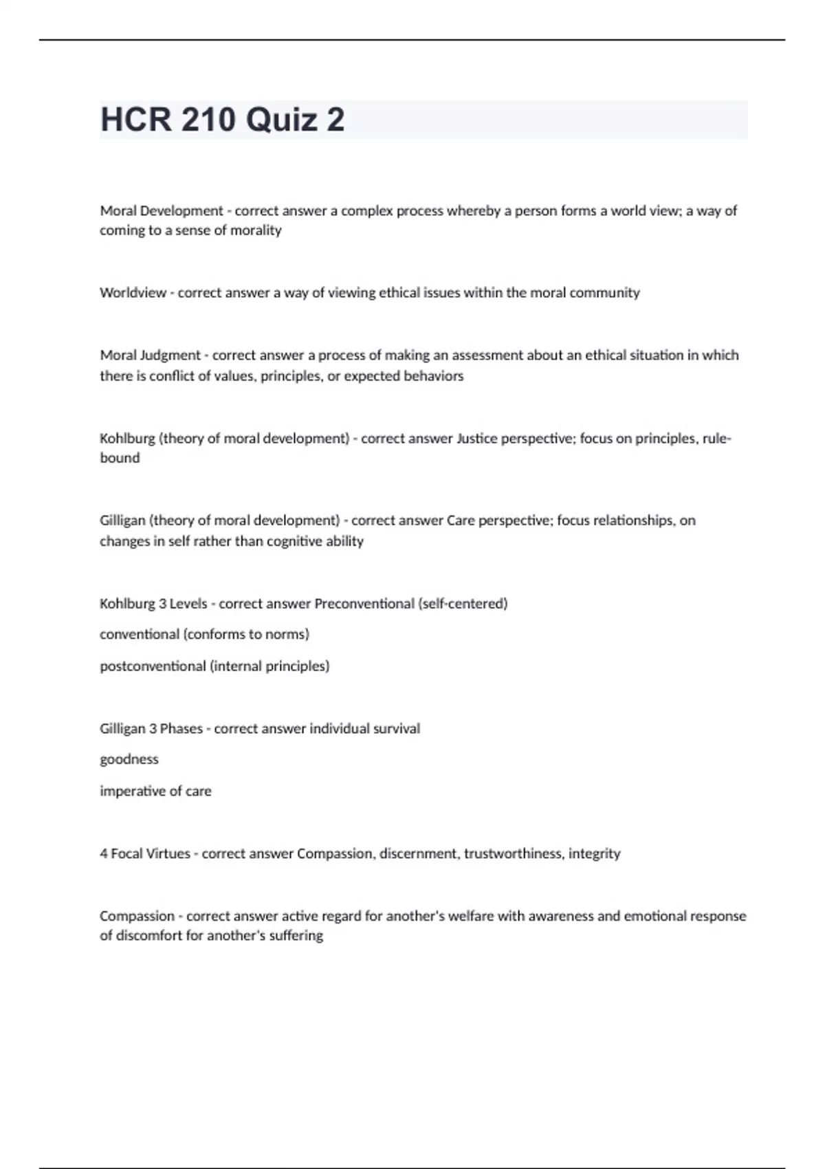 HCR 210 Quiz 2Moral Development - correct answer a complex process whereby a person forms a world view; a way of coming to a sense of morality Worldview - correct answer a way of viewing ethical issues within the moral community Moral Judgment - correct answer a process of making an assessment about an ethical situation in which there is conflict of values, principles, or expected behaviors Kohlburg (theory of moral development) - correct answer Justice perspective; focus on principles, rule-bound Gilligan (theory of moral development) - correct answer Care perspective; focus relationships, on changes in self rather than cognitive ability Kohlburg 3 Levels - correct answer Preconventional (self-centered) conventional (conforms to norms) postconventional (internal principles) Gilligan 3 Phases - correct answer individual survival goodness imperative of care 4 Focal Virtues - correct answer Compassion, discernment, trustworthiness, integrity