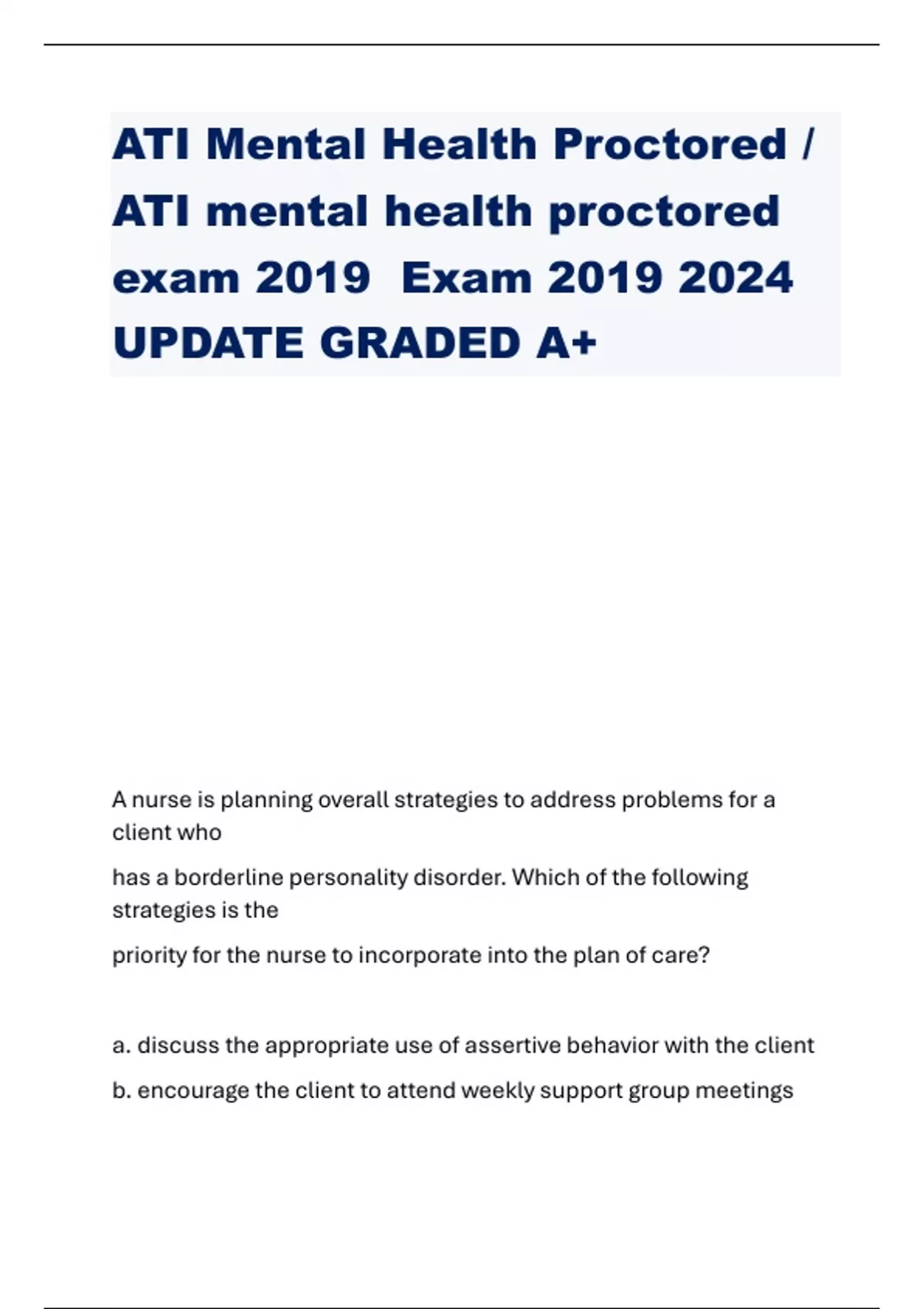 ATI Mental Health Proctored / ATI mental health proctored exam 2019 Exam UPDATE GRADED A+ A nurse is planning overall strategies to address problems for a client who has a borderline personality disorder. Which of the following strategies is the priority for the nurse to incorporate into the plan of care? a. discuss the appropriate use of assertive behavior with the client b. encourage the client to attend weekly support group meetings c. assist the client to maintain awareness of her thoughts and feelings d. implement measures to prevent intentional self-inflicted injury - ANSWER-d. implement measures to prevent intentional selfinflicted injury A nurse is admitting a client who has a generalized anxiety disorder. Which of the following actions should the nurse plan to take first? a. Provide the client with a quiet environment b. Determine how the client handles stress. c. Teach the client to use guided imagery. d. Ask the client to identify her strengths - ANSWER-a. Provide the client with a quiet environment A nurse is conducting an admission interview with a client who is experiencing mania. Which of the following should the nurse report to the provider? a. States that he hasn't bathed in 2 days b. Reports eating twice in the past two weeks. c. Makes inappropriate sexual comments. d. Speaks in rhyming sentences. - ANSWER-b. Reports eating twice in the past two weeks.