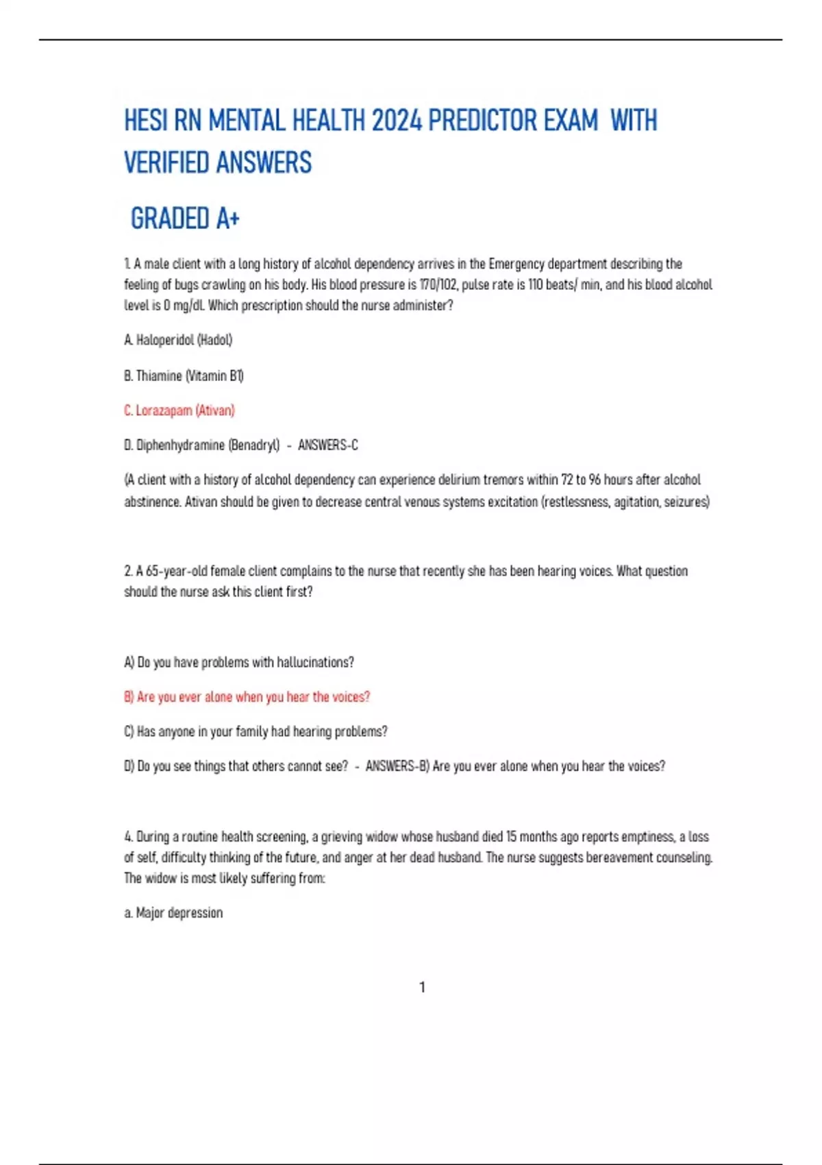 HESI RN MENTAL HEALTH 2024 PREDICTOR EXAM WITH VERIFIED ANSWERS GRADED A+HESI RN MENTAL HEALTH 2024 PREDICTOR EXAM WITH VERIFIED ANSWERS GRADED A+