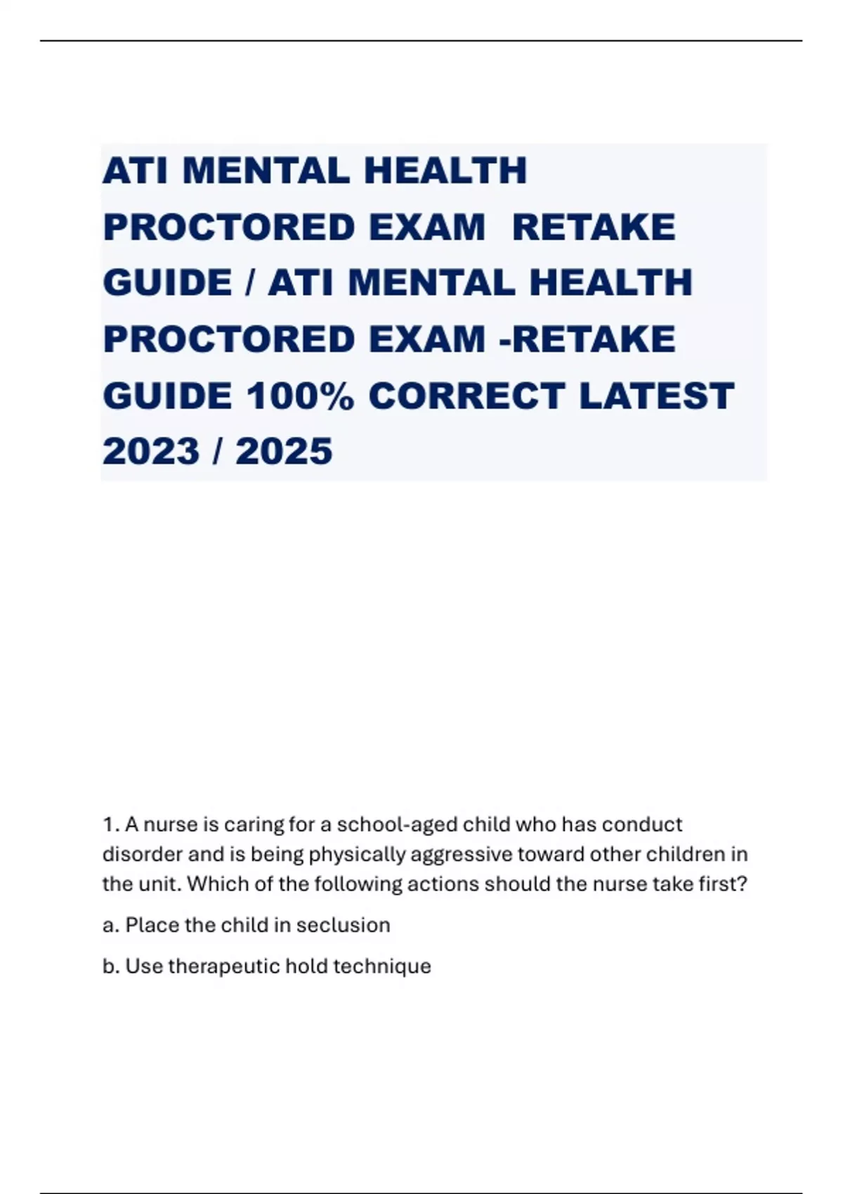 ATI MENTAL HEALTH PROCTORED EXAM RETAKE GUIDE / ATI MENTAL HEALTH PROCTORED EXAM -RETAKE GUIDE 100% CORRECT LATEST 2023 / 2025 1. A nurse is caring for a school-aged child who has conduct disorder and is being physically aggressive toward other children in the unit. Which of the following actions should the nurse take first? a. Place the child in seclusion b. Use therapeutic hold technique c. Apply wrist restraints d. Administer risperidone - ANSWER-a. Place the child in seclusion 2• A nurse is caring for a client who has a new diagnosis of bulimia nervosa. Which of the following diagnosis procedures should the nurse anticipate the provider should describe during the medical evaluation? a. Chest x-ray b