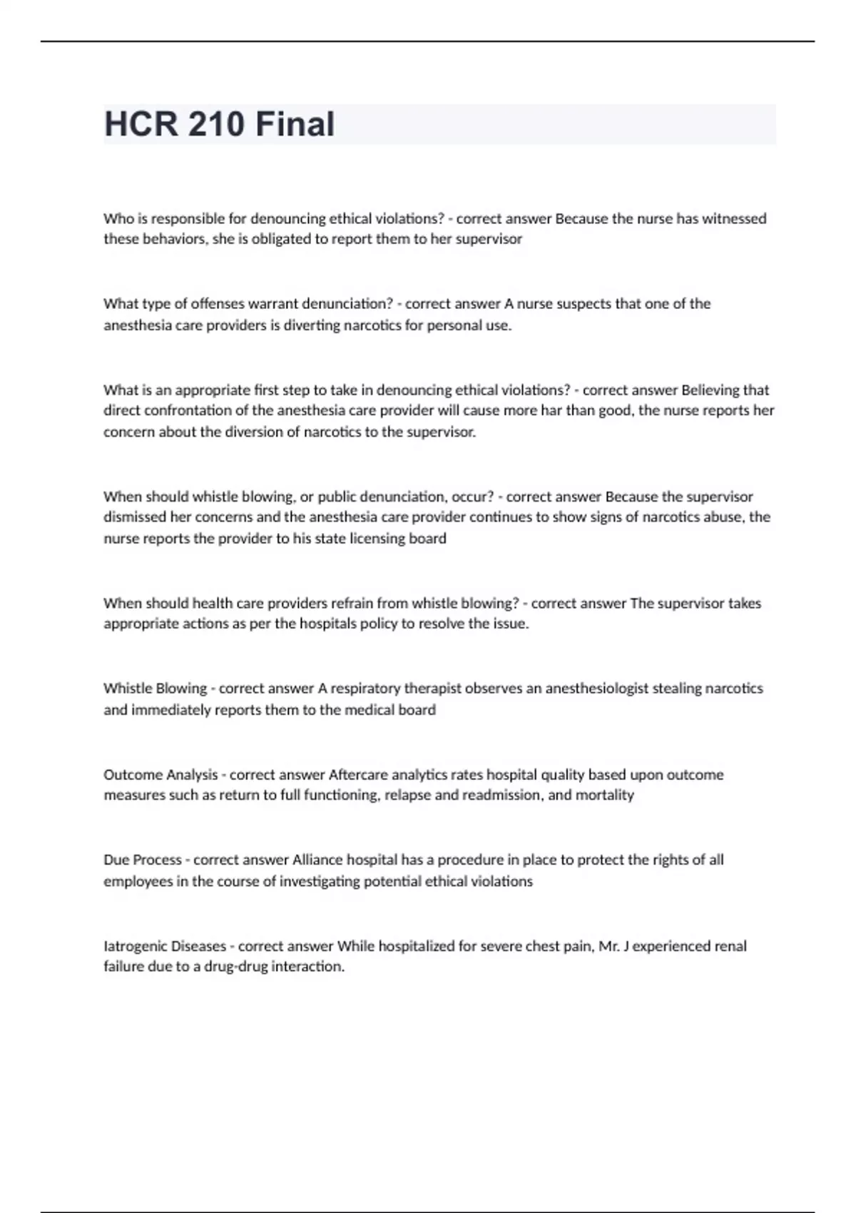 HCR 210 Final Who is responsible for denouncing ethical violations? - correct answer Because the nurse has witnessed these behaviors, she is obligated to report them to her supervisor What type of offenses warrant denunciation? - correct answer A nurse suspects that one of the anesthesia care providers is diverting narcotics for personal use. What is an appropriate first step to take in denouncing ethical violations? - correct answer Believing that direct confrontation of the anesthesia care provider will cause more har than good, the nurse reports her concern about the diversion of narcotics to the supervisor. When should whistle blowing, or public denunciation, occur? - correct answer Because the supervisor dismissed her concerns and the anesthesia care provider continues to show signs of narcotics abuse, the nurse reports the provider to his state licensing board When should health care providers refrain from whistle blowing? - correct answer The supervisor takes appropriate actions as per the hospitals policy to resolve the issue. Whistle Blowing - correct answer A respiratory therapist observes an anesthesiologist stealing narcotics and immediately reports them to the medical board Outcome Analysis - correct answer Aftercare analytics rates hospital quality based upon outcome measures such as return to full functioning, relapse and readmission, and mortality Due Process - correct answer Alliance hospital has a procedure in place to protect the rights of all employees in the course of investigating potential ethical violations Iatrogenic Diseases - correct answer While hospitalized for severe chest pain, Mr. J experienced renal failure due to a drug-drug interaction.