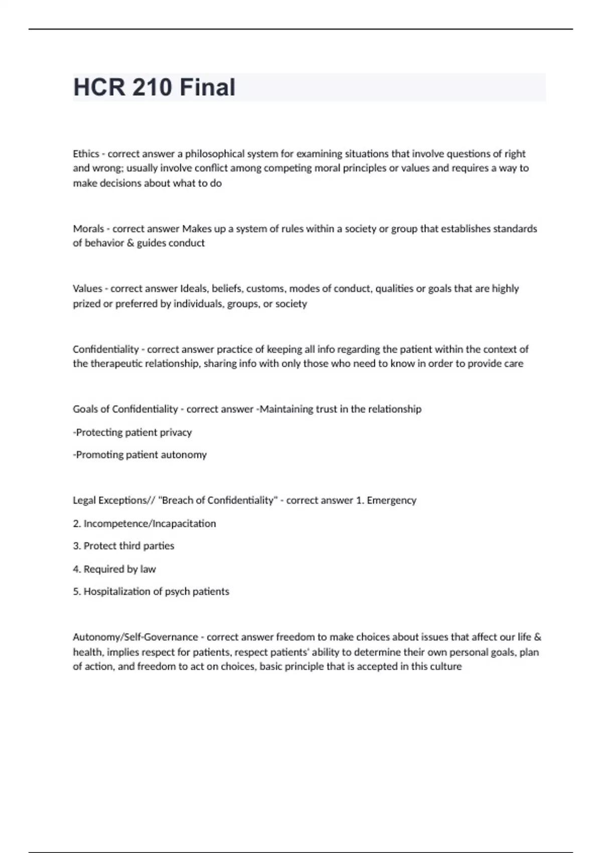 HCR 210 FinalEthics - correct answer a philosophical system for examining situations that involve questions of right and wrong; usually involve conflict among competing moral principles or values and requires a way to make decisions about what to do Morals - correct answer Makes up a system of rules within a society or group that establishes standards of behavior & guides conduct Values - correct answer Ideals, beliefs, customs, modes of conduct, qualities or goals that are highly prized or preferred by individuals, groups, or society Confidentiality - correct answer practice of keeping all info regarding the patient within the context of the therapeutic relationship, sharing info with only those who need to know in order to provide care Goals of Confidentiality - correct answer -Maintaining trust in the relationship -Protecting patient privacy -Promoting patient autonomy Legal Exceptions// "Breach of Confidentiality" - correct answer 1. Emergency 2. Incompetence/Incapacitation 3. Protect third parties 4. Required by law 5. Hospitalization of psych patients Autonomy/Self-Governance - correct answer freedom to make choices about issues that affect our life & health, implies respect for patients, respect patients' ability to determine their own personal goals, plan of action, and freedom to act on choices, basic principle that is accepted in this culture