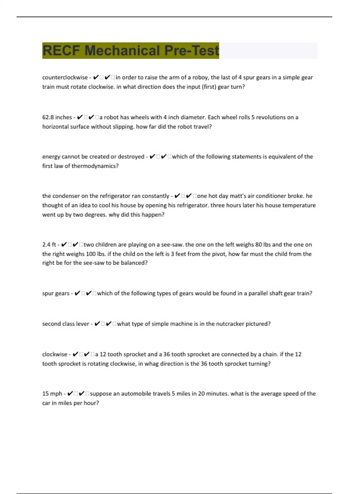 RECF Mechanical Pre-Test CORRECTLY SOLVED QUESTIONS|SCORE A+