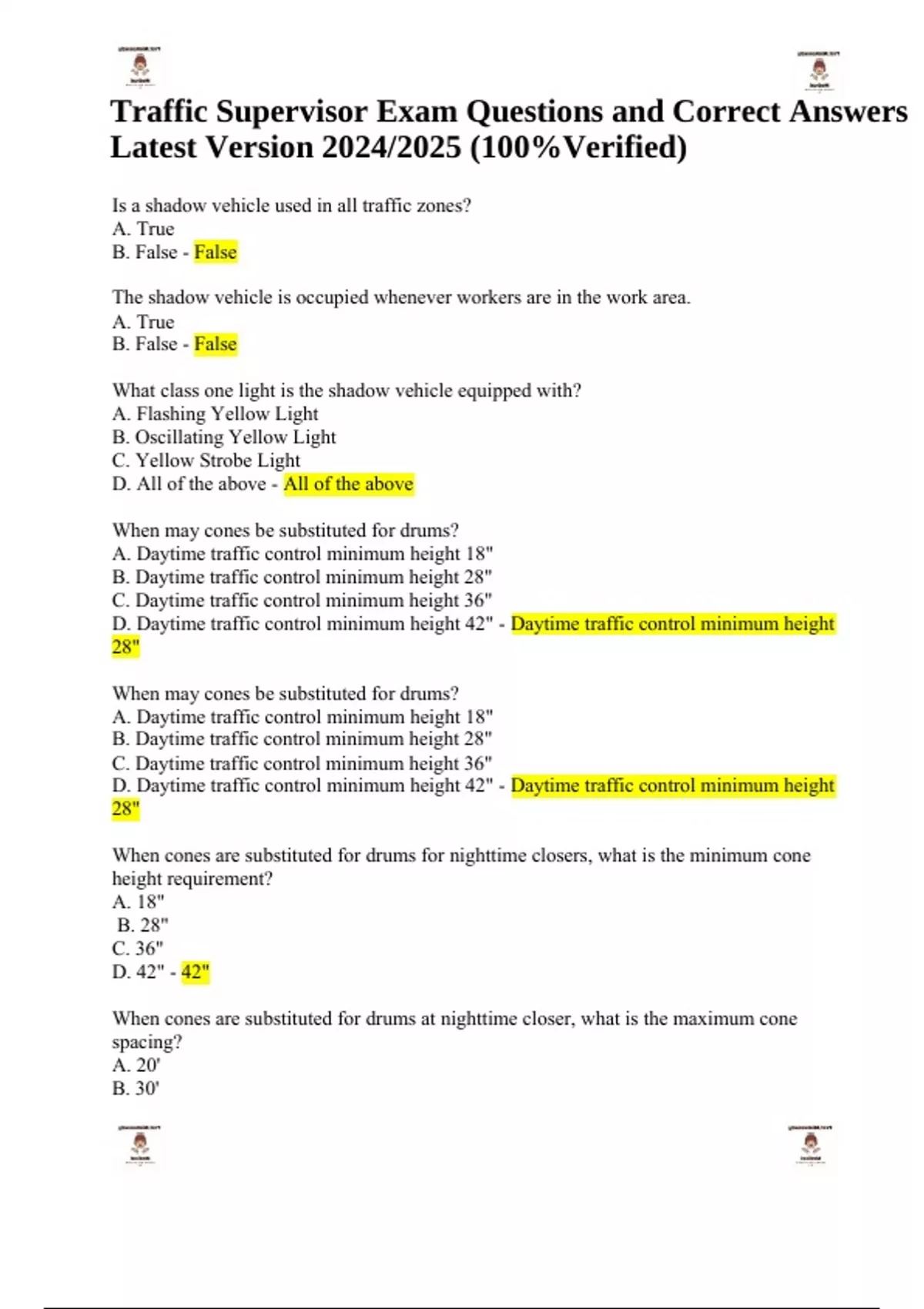 Traffic Supervisor Exam Questions and Correct Answers Latest Version 2024/2025 (100%Verified). Is a shadow vehicle used in all traffic zones? A. True B. False - False The shadow vehicle is occupied whenever workers are in the work area. A. True B. False - False What class one light is the shadow vehicle equipped with? A. Flashing Yellow Light B. Oscillating Yellow Light C. Yellow Strobe Light D. All of the above - All of the above When may cones be substituted for drums? A. Daytime traffic control minimum height 18" B. Daytime traffic control minimum height 28" C. Daytime traffic control minimum height 36" D. Daytime traffic control minimum height 42" - Daytime traffic control minimum height 28" When may cones be substituted for drums? A. Daytime traffic control minimum height 18" B. Daytime traffic control minimum height 28" C. Daytime traffic control minimum height 36" D. Daytime traffic control minimum height 42" - Daytime traffic control minimum height 28" When cones are substituted for drums for nighttime closers, what is the minimum cone height requirement? A. 18" B. 28" C. 36" D. 42" - 42" When cones are substituted for drums at nighttime closer, what is the maximum cone spacing? A. 20' B. 30' Traffic Supervisor Exam Questions and Correct Answers Latest Version 2024/2025 (100%Verified) C. 40' D. 50' - 40' What type of flashing warning lights are required when there is a nighttime lane closer? A. ROAD WORK AHEAD B. LANE CLOSED AHEAD C. A & B D. NONE OF THE ABOVE - ROAD WORK AHEAD & LANE CLOSED AHEAD If there is a lane closure of greater than three days, what is required? A. Work zone dotted lines, 4' in length separated by 10' gaps, shall be provided to identify the merge. B. The appropriate color work zone edge lines shall be applied along the taper and tangent sections. C. All the above D. None of the above - The appropriate color work zone edge lines shall be applied along the taper and tangent sections. Work zone pavement marking that conflict with final traffic lanes shall be temporary paint. A. True B. False - False What are the extra advance warning signs? A. Lane Close Ahead B. Watch for Stopped Traffic C. Road Work Ahead D. All the above - Lane Change Ahead & Watch for Stopped Traffic & Road Work Ahead Is the advisory speed plaque used in all traffic zones? A. True B. False - False When the approach speed limit is 40 mph or less, 36" warning signs may be used. A. True B. False - True Road Work Ahead signs shall be provided on entrance ramps or roadways entering the work limits. A. True B. False - True End Road Work signs are only required for lane closures of more than ______ day. A. 1 B. 2 C. 3 D 4 - 1 Sign spacing should be adjusted to avoid conflict with existing signs, minimum spacing to existing signs shall be 200' for speeds of 45 mph or less and a minimum of 400' for speeds 50 mph or greater. A. True B. False - True The minimum acceptable length for the merge taper shall be determined by _________ the width of the offset by the merge taper rate. A. Subtracting B. Adding C. Divide D. Multiplying - Multiplying The tangent (recovery area) section between the two merge tapers should be 2 times longer of the two merge tapers. A. True B. False - True What is a fundamental principle of temporary traffic control? A. To inconvenience motorists as much as possible so they will find another route. B. To guide and direct motorists through or around the work area as efficiently as possible. C. To make traffic move as slow as possible. D. All of the above are fundamental principles. - To guide and direct motorists through or around the work area as efficiently as possible.