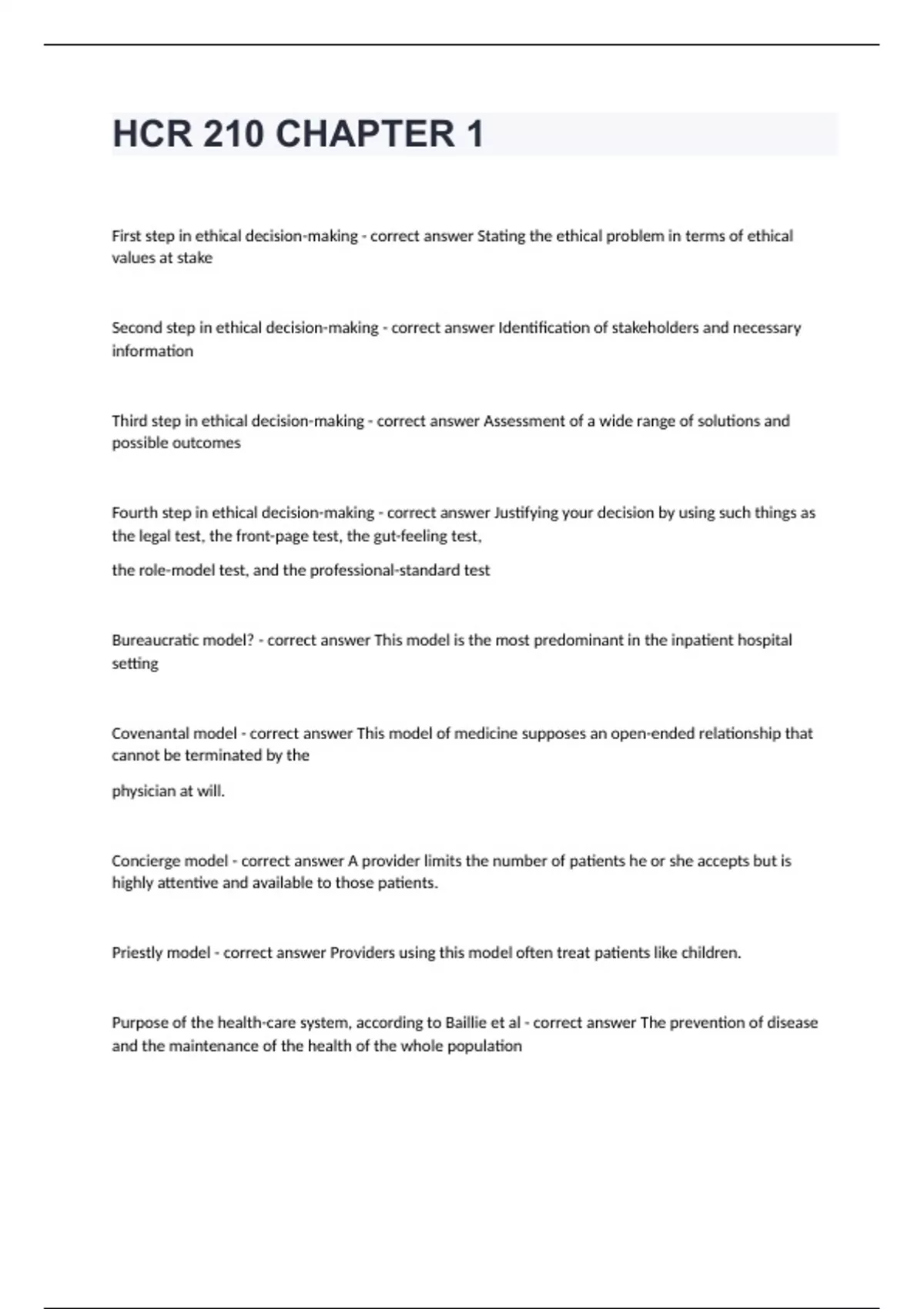 HCR 210 CHAPTER 1First step in ethical decision-making - correct answer Stating the ethical problem in terms of ethical values at stake Second step in ethical decision-making - correct answer Identification of stakeholders and necessary information Third step in ethical decision-making - correct answer Assessment of a wide range of solutions and possible outcomes Fourth step in ethical decision-making - correct answer Justifying your decision by using such things as the legal test, the front-page test, the gut-feeling test, the role-model test, and the professional-standard test Bureaucratic model? - correct answer This model is the most predominant in the inpatient hospital setting Covenantal model - correct answer This model of medicine supposes an open-ended relationship that cannot be terminated by the physician at will. Concierge model - correct answer A provider limits the number of patients he or she accepts but is highly attentive and available to those patients. Priestly model - correct answer Providers using this model often treat patients like children. Purpose of the health-care system, according to Baillie et al - correct answer The prevention of disease and the maintenance of the health of the whole population