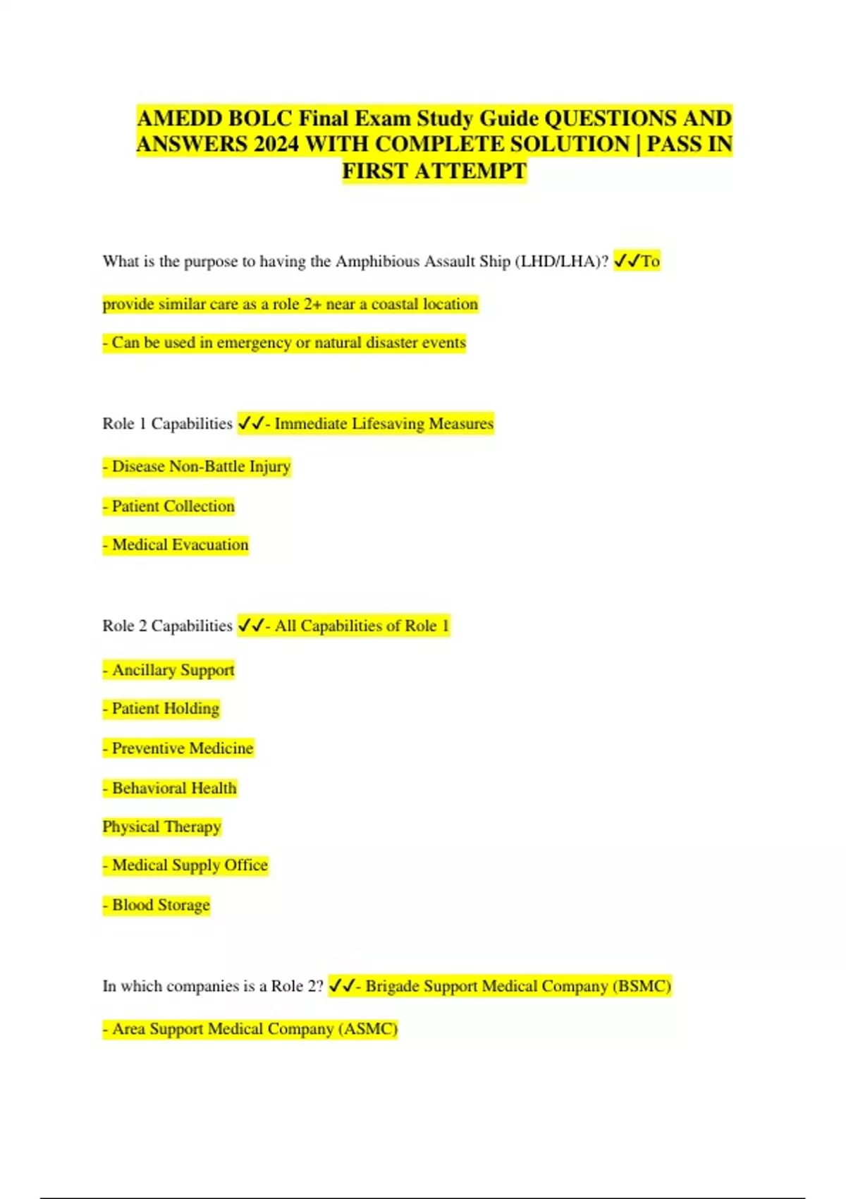 AMEDD BOLC Final Exam Study Guide QUESTIONS AND ANSWERS 2024 WITH COMPLETE SOLUTION | PASS IN FIRST ATTEMPT What is the purpose to having the Amphibious Assault Ship (LHD/LHA)? To provide similar care as a role 2+ near a coastal location - Can be used in emergency or natural disaster events Role 1 Capabilities - Immediate Lifesaving Measures - Disease Non-Battle Injury - Patient Collection - Medical Evacuation Role 2 Capabilities - All Capabilities of Role 1 - Ancillary Support - Patient Holding - Preventive Medicine - Behavioral Health Physical Therapy - Medical Supply Office - Blood Storage In which companies is a Role 2? - Brigade Support Medical Company (BSMC) - Area Support Medical Company (ASMC)