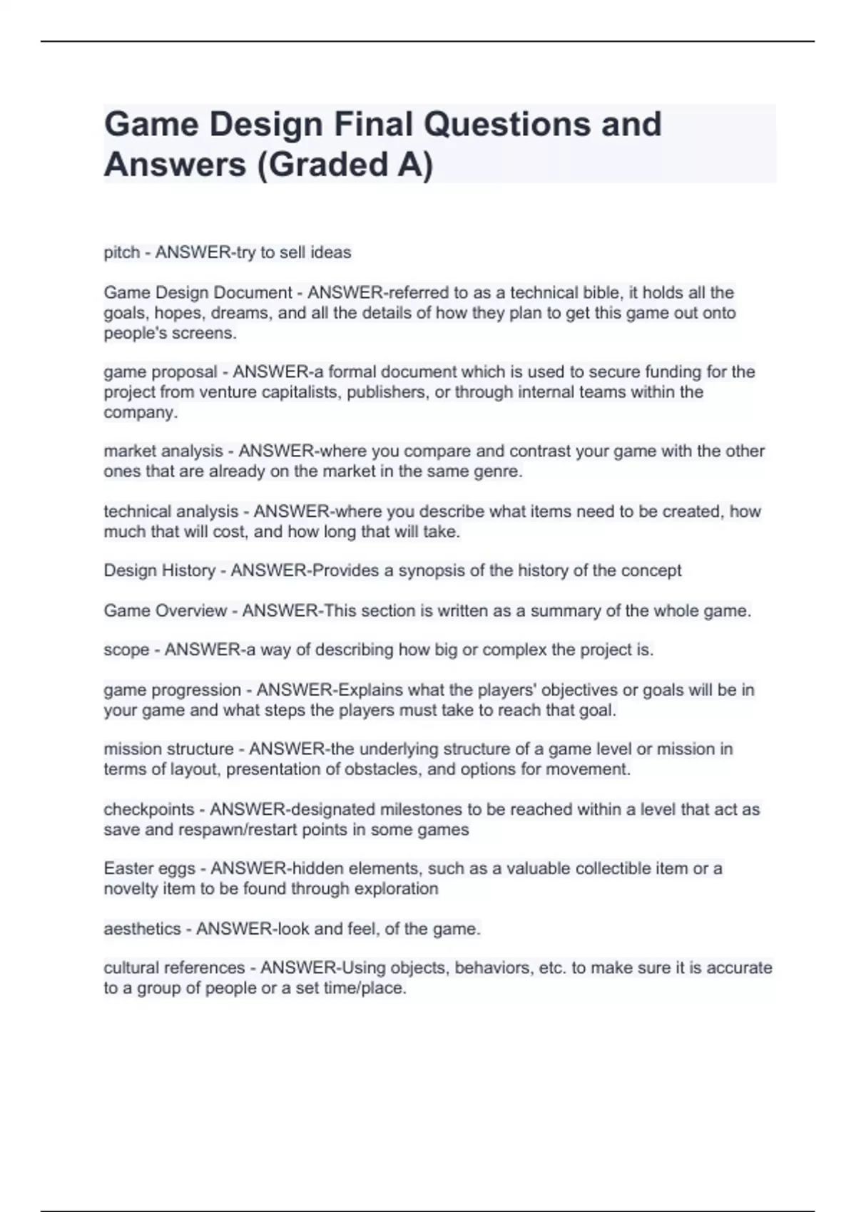 Game Design Final Questions and Answers (Graded A) Game Design Final Questions and Answers (Graded A) Game Design Final Questions and Answers (Graded A) Game Design Final Questions and Answers (Graded A) pitch - ANSWER-try to sell ideas Game Design Document - ANSWER-referred to as a technical bible, it holds all the goals, hopes, dreams, and all the details of how they plan to get this game out onto people's screens. game proposal - ANSWER-a formal document which is used to secure funding for the project from venture capitalists, publishers, or through internal teams within the company.