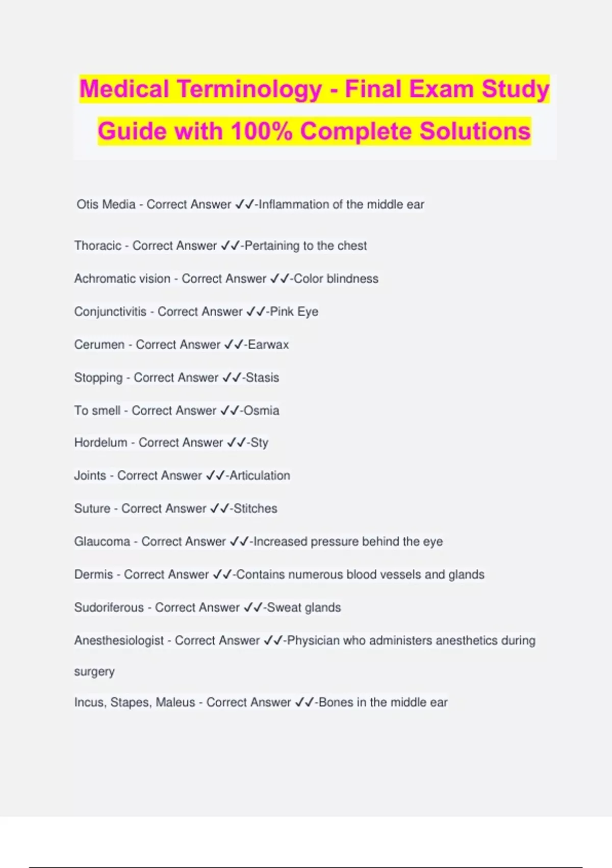Medical Terminology - Final Exam Study Guide with 100% Complete Solutions Otis Media - Correct Answer ️️ -Inflammation of the middle ear Thoracic - Correct Answer ️️ -Pertaining to the chest Achromatic vision - Correct Answer ️️ -Color blindness Conjunctivitis - Correct Answer ️️ -Pink Eye Cerumen - Correct Answer ️️ -Earwax Stopping - Correct Answer ️️ -Stasis To smell - Correct Answer ️️ -Osmia Hordelum - Correct Answer ️️ -Sty Joints - Correct Answer ️️ -Articulation Suture - Correct Answer ️️ -Stitches Glaucoma - Correct Answer ️️ -Increased pressure behind the eye Dermis - Correct Answer ️️ -Contains numerous blood vessels and glands Sudoriferous - Correct Answer ️️ -Sweat glands Anesthesiologist - Correct Answer ️️ -Physician who administers anesthetics during surgery Incus, Stapes, Maleus - Correct Answer ️️ -Bones in the middle ear