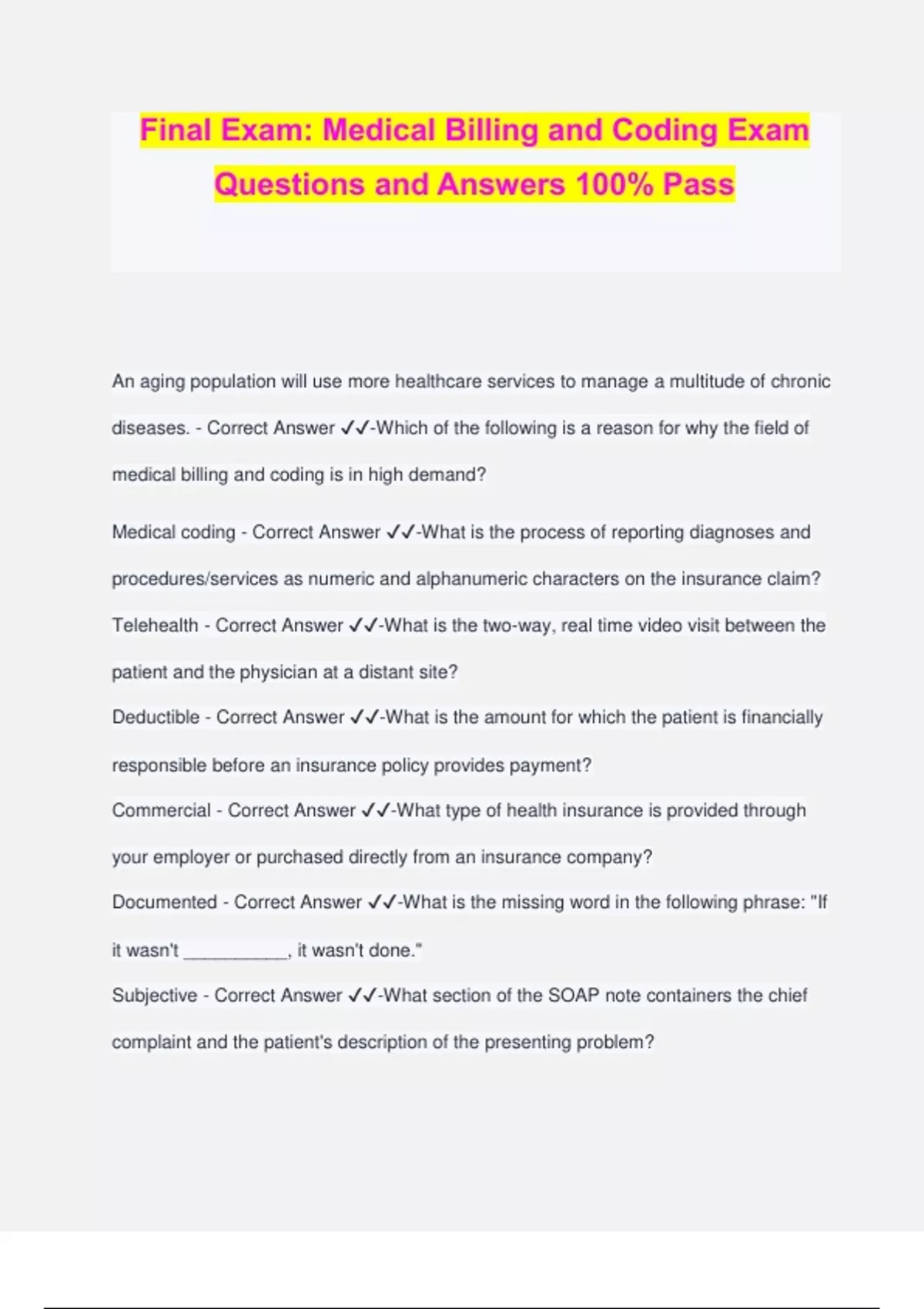 Final Exam: Medical Billing and Coding Exam Questions and Answers 100% Pass An aging population will use more healthcare services to manage a multitude of chronic diseases. - Correct Answer ️️ -Which of the following is a reason for why the field of medical billing and coding is in high demand? Medical coding - Correct Answer ️️ -What is the process of reporting diagnoses and procedures/services as numeric and alphanumeric characters on the insurance claim? Telehealth - Correct Answer ️️ -What is the two-way, real time video visit between the patient and the physician at a distant site? Deductible - Correct Answer ️️ -What is the amount for which the patient is financially responsible before an insurance policy provides payment? Commercial - Correct Answer ️️ -What type of health insurance is provided through your employer or purchased directly from an insurance company? Documented - Correct Answer ️️ -What is the missing word in the following phrase: "If it wasn't __________, it wasn't done." Subjective - Correct Answer ️️ -What section of the SOAP note containers the chief complaint and the patient's description of the presenting problem? Electronic Health Record (EHR) - Correct Answer ️️ -What is health information in a digital format that is created and shared by providers across more Thant one healthcare setting? Bundled payment - Correct Answer ️️ -What is the reimbursement method where one payment covers all services during an episode of care? Referral - Correct Answer ️️ -What is a written order from you primary care provider for you to see a specialist or get certain medical services? Consumer-directed health plans - Correct Answer ️️ -What health plans are designed to put more responsibility on the employee for their healthcare spending? Accounts receivable - Correct Answer ️️ -In a physician practice, revenue cycle management is also called what? Electronic Data Interchange (EDI) - Correct Answer ️️ -What is the computer to computer transfer of data between providers and third-party payers? Rejected claim - Correct Answer ️️ -What type of claim was never entered in to the computer system of the insurance company because it failed to meet specific data requirements? Allowable charge - Correct Answer ️️ -What is the maximum amount that an insurer will reimburse for a covered service or procedure? Patients are informed about what charges to expect. - Correct Answer ️️ -What is the price transparency in healthcare? Emancipated minor - Correct Answer ️️ -What is the term for an individual who has not reached the age of majority (usually 18) but is no longer under the care and control of parents? Protected Health Information (PHI) - Correct Answer ️️ -What is any infor