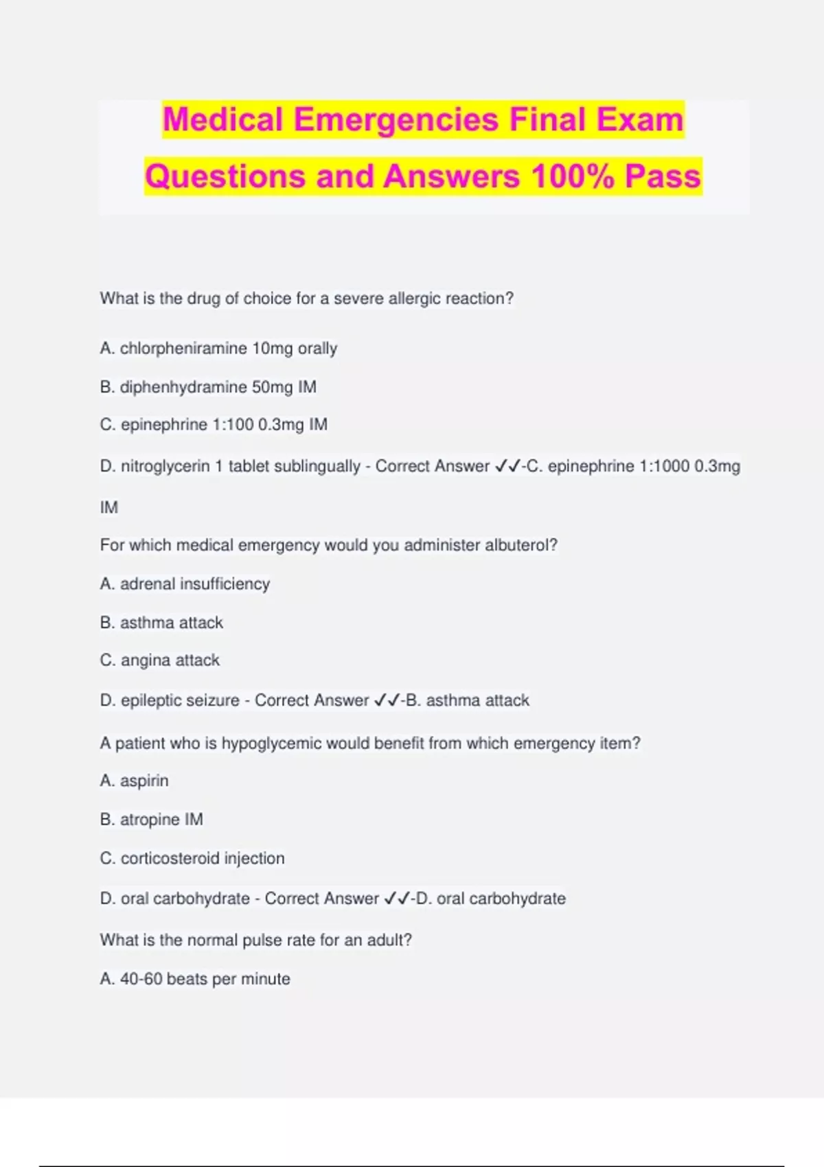 Medical Emergencies Final Exam Questions and Answers 100% Pass What is the drug of choice for a severe allergic reaction? A. chlorpheniramine 10mg orally B. diphenhydramine 50mg IM C. epinephrine 1:100 0.3mg IM D. nitroglycerin 1 tablet sublingually - Correct Answer ️️ -C. epinephrine 1:1000 0.3mg IM For which medical emergency would you administer albuterol? A. adrenal insufficiency B. asthma attack C. angina attack D. epileptic seizure - Correct Answer ️️ -B. asthma attack A patient who is hypoglycemic would benefit from which emergency item? A. aspirin B. atropine IM C. corticosteroid injection D. oral carbohydrate - Correct Answer ️️ -D. oral carbohydrate What is the normal pulse rate for an adult? A. 40-60 beats per minute B. 60-80 beats per minute C. 80-100 beats per minute D. greater than 100 beats per minute - Correct Answer ️️ -B. 60-80 beats per minute An irregular pulse rate is often indicative of which of the following conditions? A. congestive heart failure B. infective endocarditis C. hypertension D. cardiac arrhythmia - Correct Answer ️️ -D. cardiac arrhythmia Tachypnea is an abnormally fast respiratory rate above 20 breaths per minute in an adult, whereas bradypnea is an abnormally slow respiratory rate less than 12 breaths per minute in an adult. Are either of these statements true or false? - Correct Answer ️️ -Both statements are true A high-pitched sound that is usually heard on expiration, but may be heard on inspiration, is referred to as? A. stridor B. Kussmaul's respirations C. wheezing D. sigh - Correct Answer ️️ -C. wheezing what is the term used for the force exerted by the blood against the blood vessel walls? A. blood pressure B. pulse rate C. stroke volume D. none of the above - Correct Answer ️️ -A. blood pressure All of the following factors affect blood pressure EXCEPT one. Which one