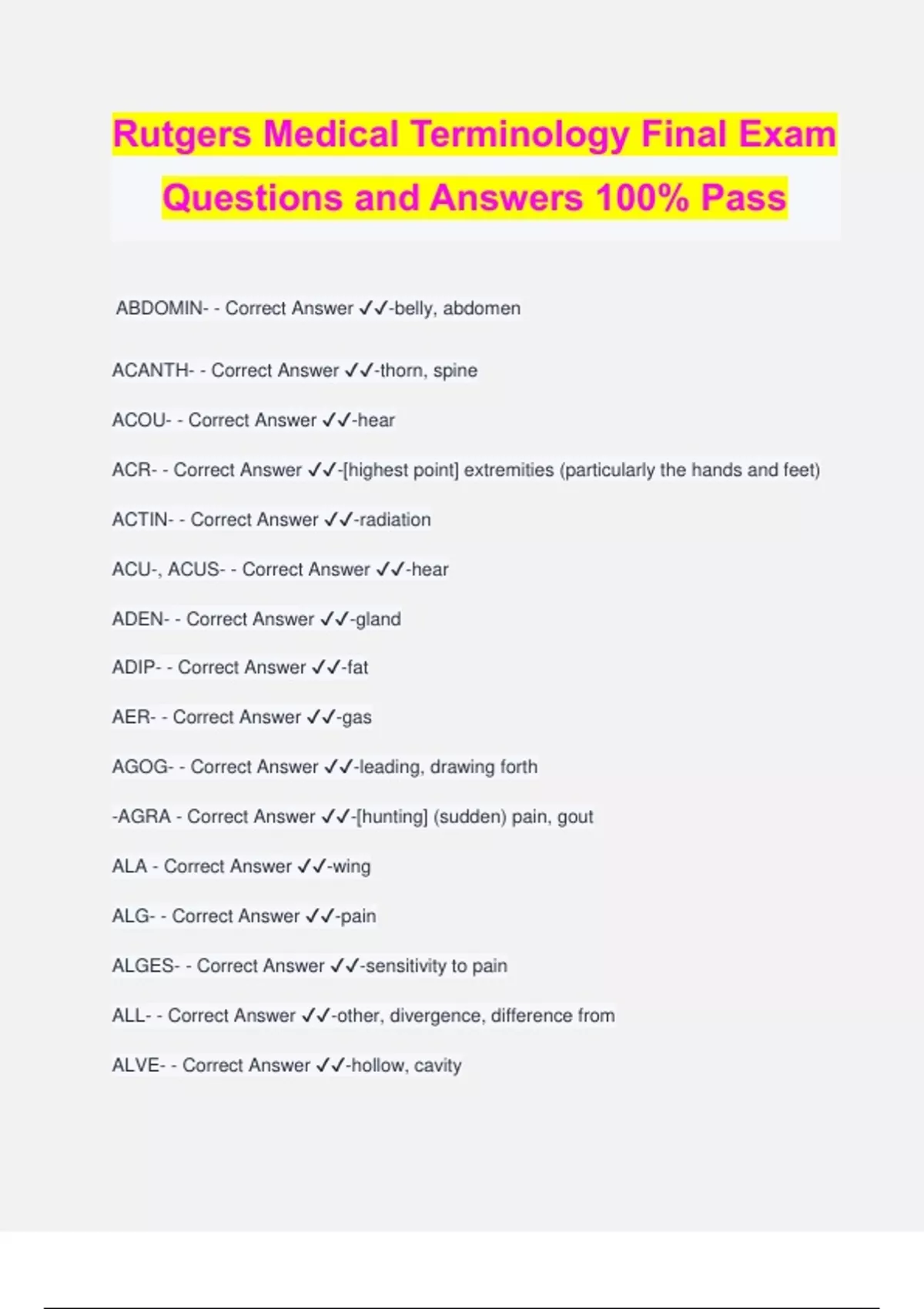 Rutgers Medical Terminology Final Exam Questions and Answers 100% Pass