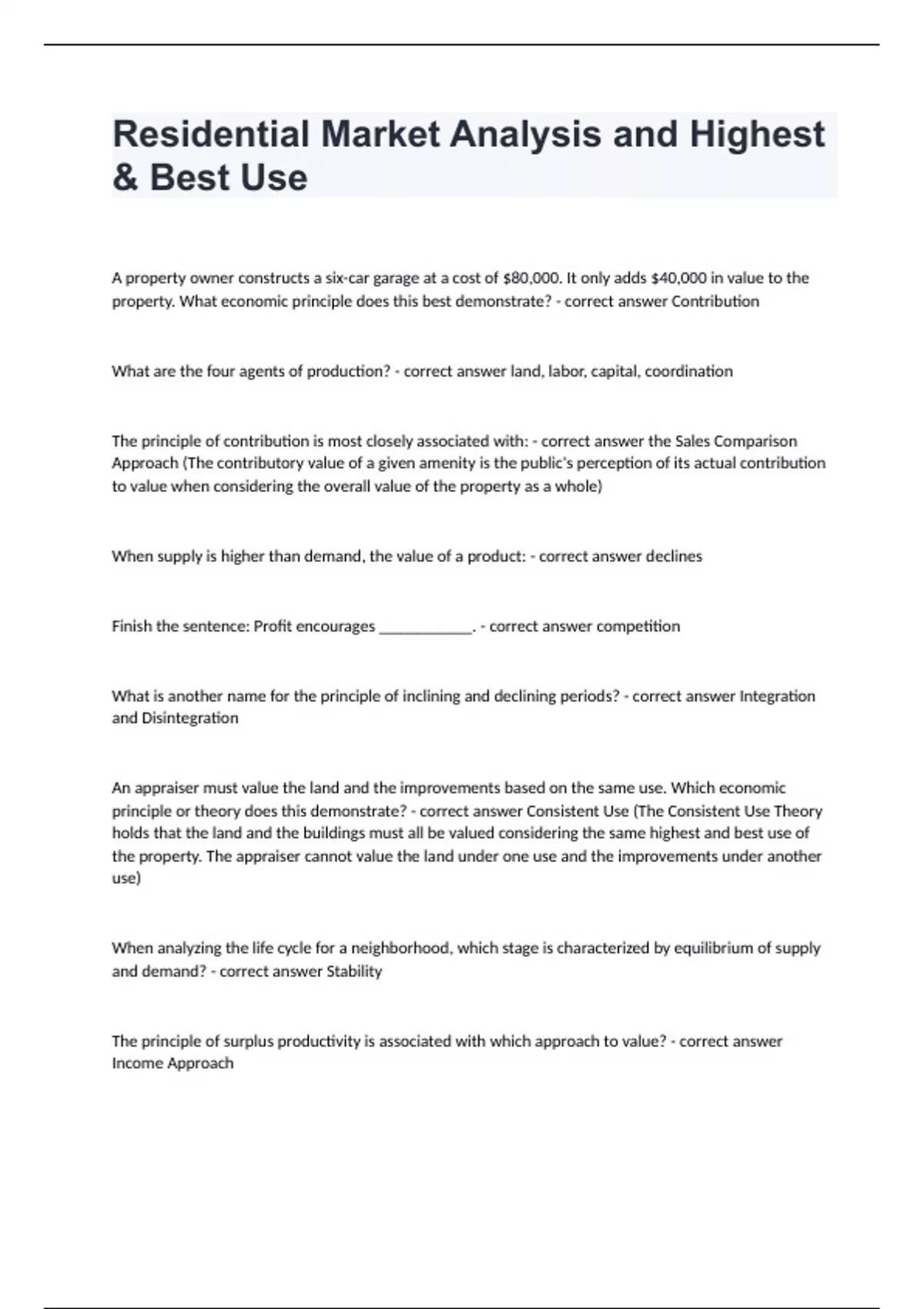 Residential Market Analysis and Highest & Best UseA property owner constructs a six-car garage at a cost of $80,000. It only adds $40,000 in value to the property. What economic principle does this best demonstrate? - correct answer Contribution What are the four agents of production? - correct answer land, labor, capital, coordination The principle of contribution is most closely associated with: - correct answer the Sales Comparison Approach (The contributory value of a given amenity is the public's perception of its actual contribution to value when considering the overall value of the property as a whole) When supply is higher than demand, the value of a product: - correct answer declines Finish the sentence: Profit encourages ___________. - correct answer competition What is another name for the principle of inclining and declining periods? - correct answer Integration and Disintegration An appraiser must value the land and the improvements based on the same use. Which economic principle or theory does this demonstrate? - correct answer Consistent Use (The Consistent Use Theory holds that the land and the buildings must all be valued considering the same highest and best use of the property. The appraiser cannot value the land under one use and the improvements under another use) When analyzing the life cycle for a neighborhood, which stage is characterized by equilibrium of supply and demand? - correct answer Stability The principle of surplus productivity is associated with which approach to value? - correct answer Income Approach