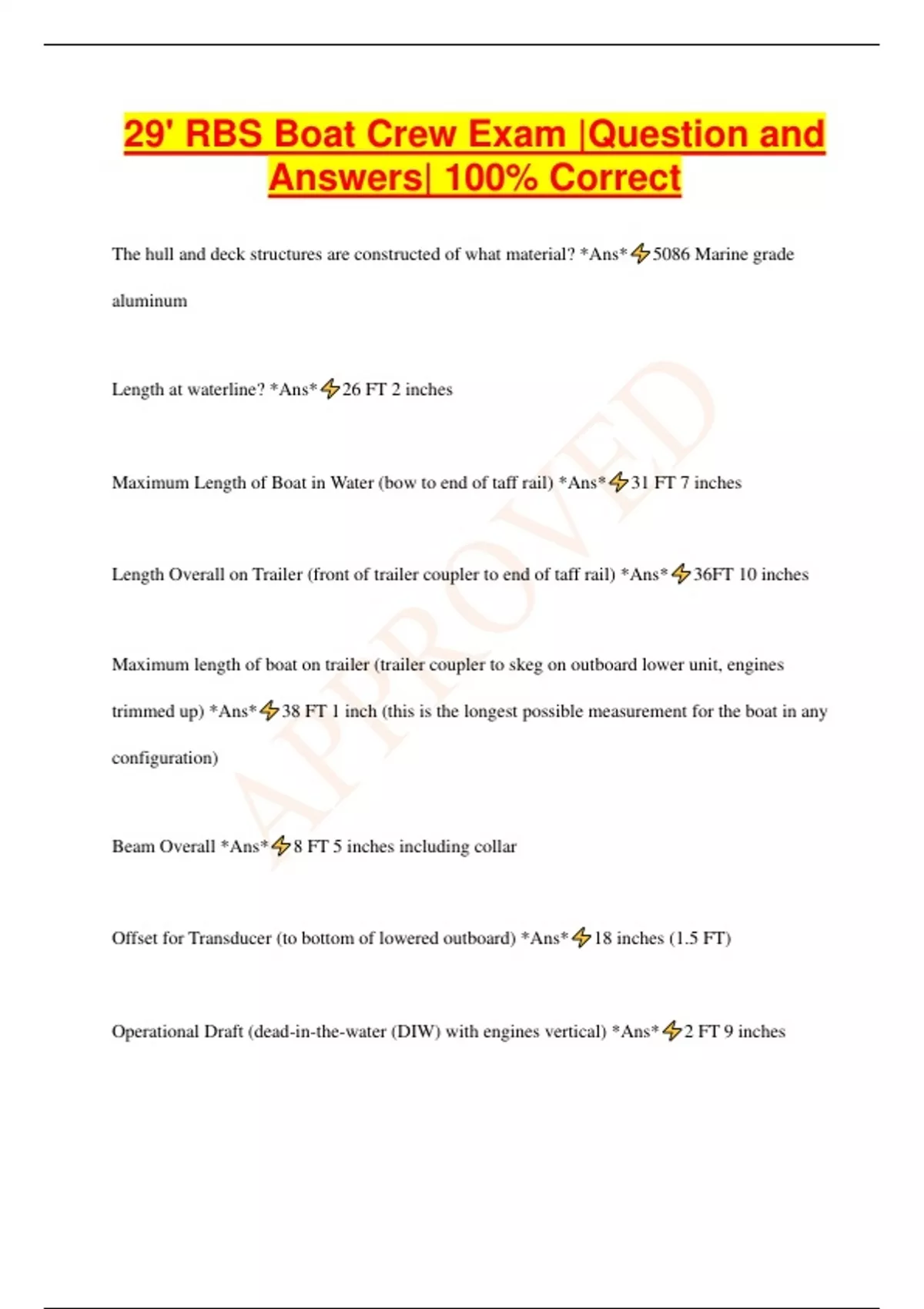 29' RBS Boat Crew Exam |Question and Answers| 100% Correct The hull and deck structures are constructed of what material? *Ans* 5086 Marine grade aluminum Length at waterline? *Ans* 26 FT 2 inches Maximum Length of Boat in Water (bow to end of taff rail) *Ans* 31 FT 7 inches Length Overall on Trailer (front of trailer coupler to end of taff rail) *Ans* 36FT 10 inches Maximum length of boat on trailer (trailer coupler to skeg on outboard lower unit, engines trimmed up) *Ans* 38 FT 1 inch (this is the longest possible measurement for the boat in any configuration) Beam Overall *Ans* 8 FT 5 inches including collar Offset for Transducer (to bottom of lowered outboard) *Ans* 18 inches (1.5 FT) Operational Draft (dead-in-the-water (DIW) with engines vertical) *Ans* 2 FT 9 inches Minimum Draft (DIW with engines raised) *Ans* 1 FT 10 inches Highest Point Above Waterline (Mast Platform UP: Searchlight) *Ans* 9 FT 10 inches Highest Fixed Point Above Waterline (Mast Platform DOWN: Cabin Top) *Ans* 7 FT 10 inches Highest Point When On Trailer (Mast Platform UP: Searchlight) *Ans* 12 FT 6 inches Highest Fixed Point When On Trailer (Mast Platform DOWN: Cabin Top) *Ans* 10 FT 6 inches Crew Capacity (shock-absorbing cabin seats) *Ans* 4 Additional Seats with Seatbelts (shock-absorbing jumpseat, folding sling seat) *Ans* 2