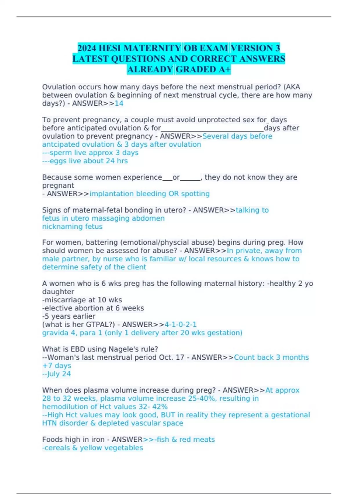 2024 HESI MATERNITY OB EXAM VERSION 3 LATEST QUESTIONS AND CORRECT ANSWERS ALREADY GRADED A+