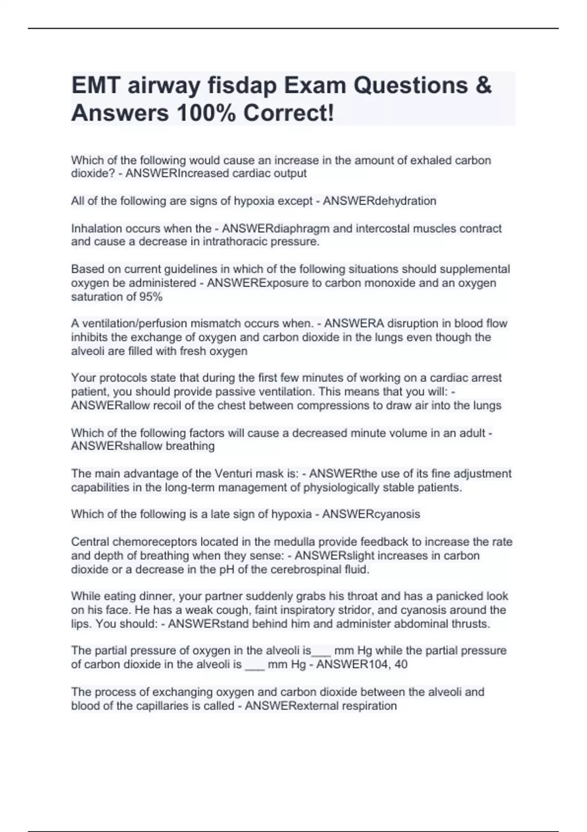 Which of the following would cause an increase in the amount of exhaled carbon dioxide? - ANSWERIncreased cardiac output All of the following are signs of hypoxia except - ANSWERdehydration Inhalation occurs when the - ANSWERdiaphragm and intercostal muscles contract and cause a decrease in intrathoracic pressure. Based on current guidelines in which of the following situations should supplemental oxygen be administered - ANSWERExposure to carbon monoxide and an oxygen saturation of 95% A ventilation/perfusion mismatch occurs when. - ANSWERA disruption in blood flow inhibits the exchange of oxygen and carbon dioxide in the lungs even though the alveoli are filled with fresh oxygen Your protocols state that during the first few minutes of working on a cardiac arrest patient, you should provide passive ventilation. This means that you will: - ANSWERallow recoil of the chest between compressions to draw air into the lungs Which of the following factors will cause a decreased minute volume in an adult - ANSWERshallow breathing The main advantage of the Venturi mask is: - ANSWERthe use of its fine adjustment capabilities in the long-term management of physiologically stable patients.
