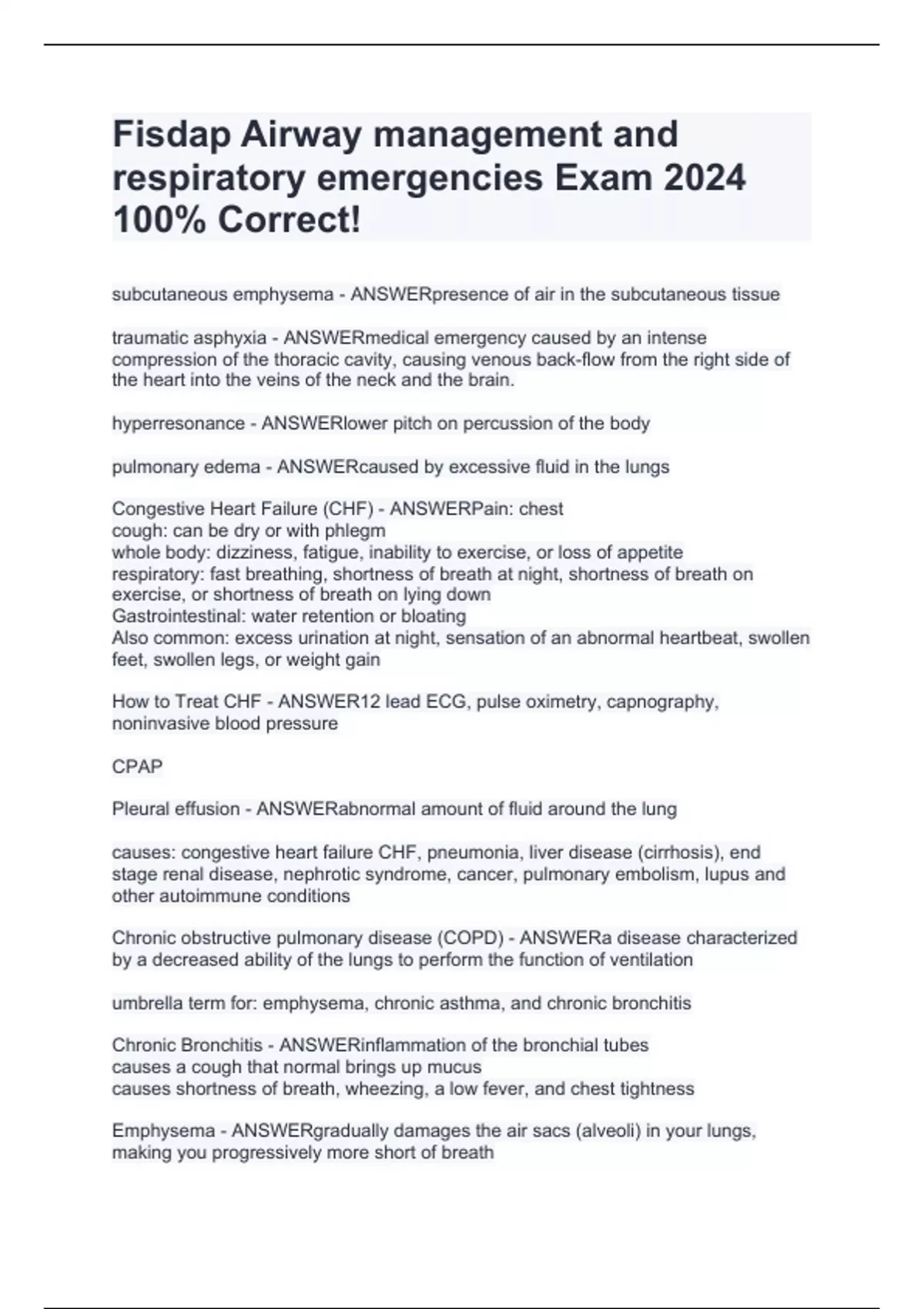 subcutaneous emphysema - ANSWERpresence of air in the subcutaneous tissue traumatic asphyxia - ANSWERmedical emergency caused by an intense compression of the thoracic cavity, causing venous back-flow from the right side of the heart into the veins of the neck and the brain. hyperresonance - ANSWERlower pitch on percussion of the body pulmonary edema - ANSWERcaused by excessive fluid in the lungs Congestive Heart Failure (CHF) - ANSWERPain: chest cough: can be dry or with phlegm whole body: dizziness, fatigue, inability to exercise, or loss of appetite respiratory: fast breathing, shortness of breath at night, shortness of breath on exercise, or shortness of breath on lying down Gastrointestinal: water retention or bloating Also common: excess urination at night, sensation of an abnormal heartbeat, swollen feet, swollen legs, or weight gain How to Treat CHF - ANSWER12 lead ECG, pulse oximetry, capnography, noninvasive blood pressure C