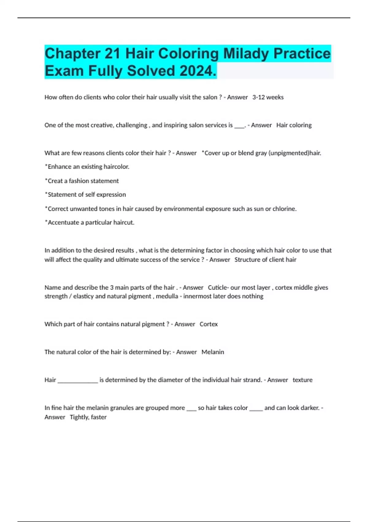 Chapter 21 Hair Coloring Milady Practice Exam Fully Solved 2024.