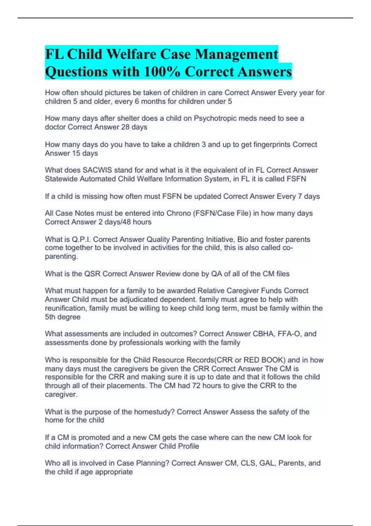 How often should pictures be taken of children in care Correct Answer Every year for children 5 and older, every 6 months for children under 5 How many days after shelter does a child on Psychotropic meds need to see a doctor Correct Answer 28 days How many days do you have to take a children 3 and up to get fingerprints Correct Answer 15 days What does SACWIS stand for and what is it the equivalent of in FL Correct Answer Statewide Automated Child Welfare Information System, in FL it is called FSFN If a child is missing how often must FSFN be updated Correct Answer Every 7 days All Case Notes must be entered into Chrono (FSFN/Case File) in how many days Correct Answer 2 days/48 hours What is Q.P.I. Correct Answer Quality Parenting Initiative, Bio and foster parents come together to be involved in activities for the child, this is also called co-parenting. What is the QSR Correct Answer Review done by QA of all of the CM files What must happen for a family to be awarded Relative Caregiver Funds Correct Answer Child must be adjudicated dependent. family must agree to help with reunification, family must be willing to keep child long term, must be family within the 5th degree What assessments are included in outcomes? Correct Answer CBHA, FFA-O, and assessments done by professionals working with the family Who is responsible for the Child Resource Records(CRR or RED BOOK) and in how many days must the caregivers be given the CRR Correct Answer The CM is responsible for the CRR and making sure it is up to date and that it follows the child through all of their placements. The CM had 72 hours to give the CRR to the caregiver. What is the purpose of the homestudy? Correct Answer Assess the safety of the home for the child If a CM is promoted and a new CM gets the case where can the new CM look for child information? Correct Answer Child Profile Who all is involved in Case Planning? Correct Answer CM, CLS, GAL, Parents, and the child if age appropriate