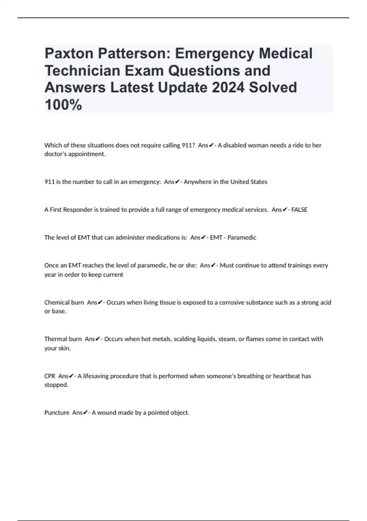 Paxton Patterson: Emergency Medical Technician Exam Questions and Answers Latest Update 2024 Solved 100%
