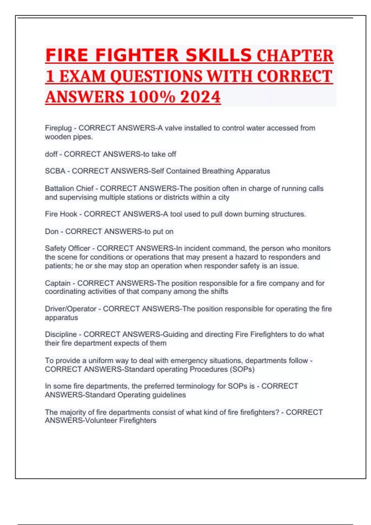 FIRE FIGHTER SKILLS CHAPTER 1 EXAM QUESTIONS WITH CORRECT ANSWERS 100% 2024
