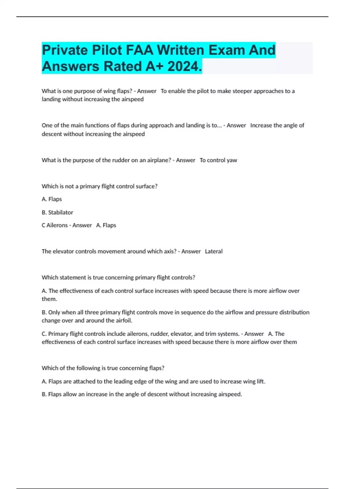 What is one purpose of wing flaps? - Answer To enable the pilot to make steeper approaches to a landing without increasing the airspeed One of the main functions of flaps during approach and landing is to... - Answer Increase the angle of descent without increasing the airspeed What is the purpose of the rudder on an airplane? - Answer To control yaw Which is not a primary flight control surface? A. Flaps B. Stabilator C Ailerons - Answer A. Flaps The elevator controls movement around which axis? - Answer Lateral Which statement is true concerning primary flight controls? A. The effectiveness of each control surface increases with speed because there is more airflow over them. B. Only when all three primary flight controls move in sequence do the airflow and pressure distribution change over and around the airfoil. C. Primary flight controls include ailerons, rudder, elevator, and trim systems. - Answer A. The effectiveness of each control surface increases with speed because there is more airflow over them Which of the following is true concerning flaps? A. Flaps are attached to the leading edge of the wing and are used to increase wing lift. B. Flaps allow an increase in the angle of descent without increasing airspeed.